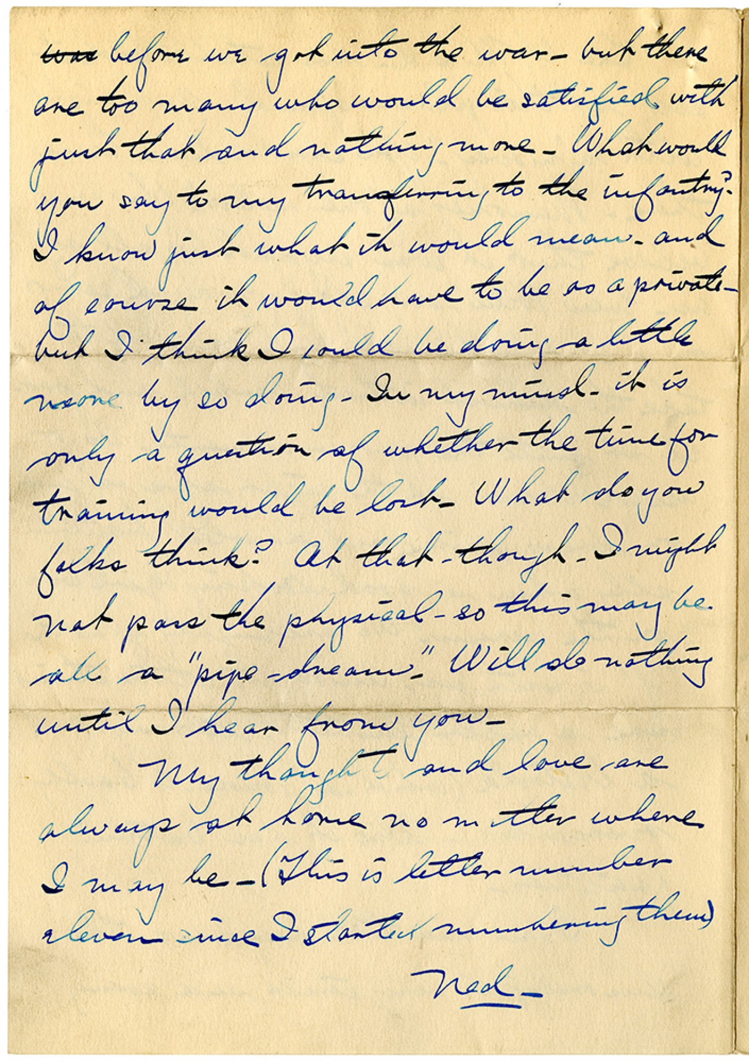 before we got into the war - but there are too many who would be satisfied with just that and nothing more. What would you say to my transferring to the infantry? I know just what it would mean - and of course it would have to be as a private - but I think I could be doing a little more by so doing. In my mind - it is only a question of whether the time for training would be lost. What do you folks think? At that - though - I might not pass the physical - so this may be all a "pipe-dream". Will do nothing until I hear from you. My thoughts and love are always at home no matter where I may be. (This is letter number eleven since I started numbering them) Ned.