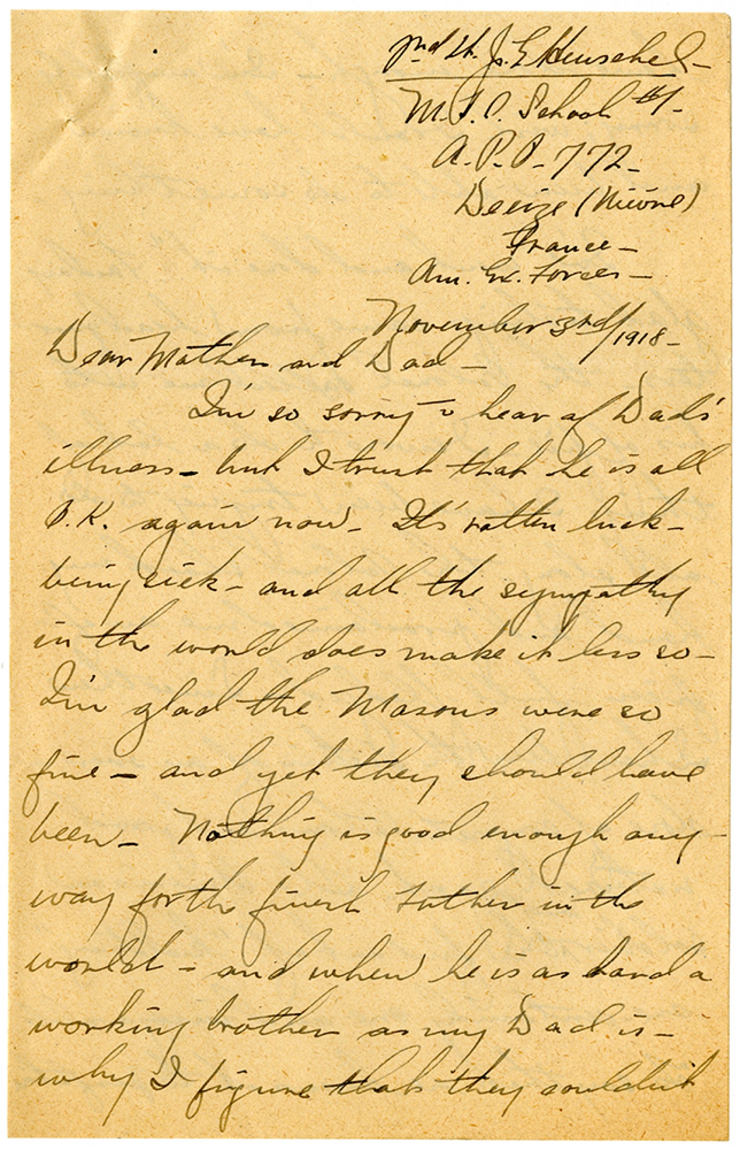 2nd Lt. J.E. Henschel - M.T.C. School #1 - A.P.O. 772 - Decize (Nievre) France - Am. Ex. Forces - November 3rd/1918 - Dear Mother and Dad - I'm so sorry to hear of Dad's illness - but I trust that he is all O.K. again now. It's rotten luck - being sick - and all the sympathy in the world does make it less so. I'm glad the Masons were so fine - and yet they should have been. Nothing is good enough anyway for the finest Father in the world - and when he is as hard a working brother as my Dad is - why I figure that they couldn't