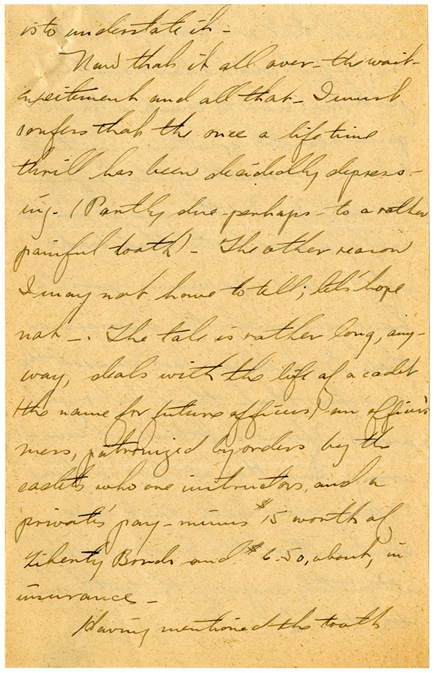 is to understate it. Now that it all over - the wait - excitement and all that - I must confess that once a life time thrill has been decidedly depressing. (Partly due - perhaps - to a rather painful tooth). The other reason I may not have to tell; let's hope not. The tale is rather long, anyway, deals with the life of a cadet (the name for future officers) an officer's mess, patronized by orders by the cadets who are instructors, and a private's pay - minus $15 worth of Liberty Bonds and $6.50, about, in insurance. Having mentioned the tooth