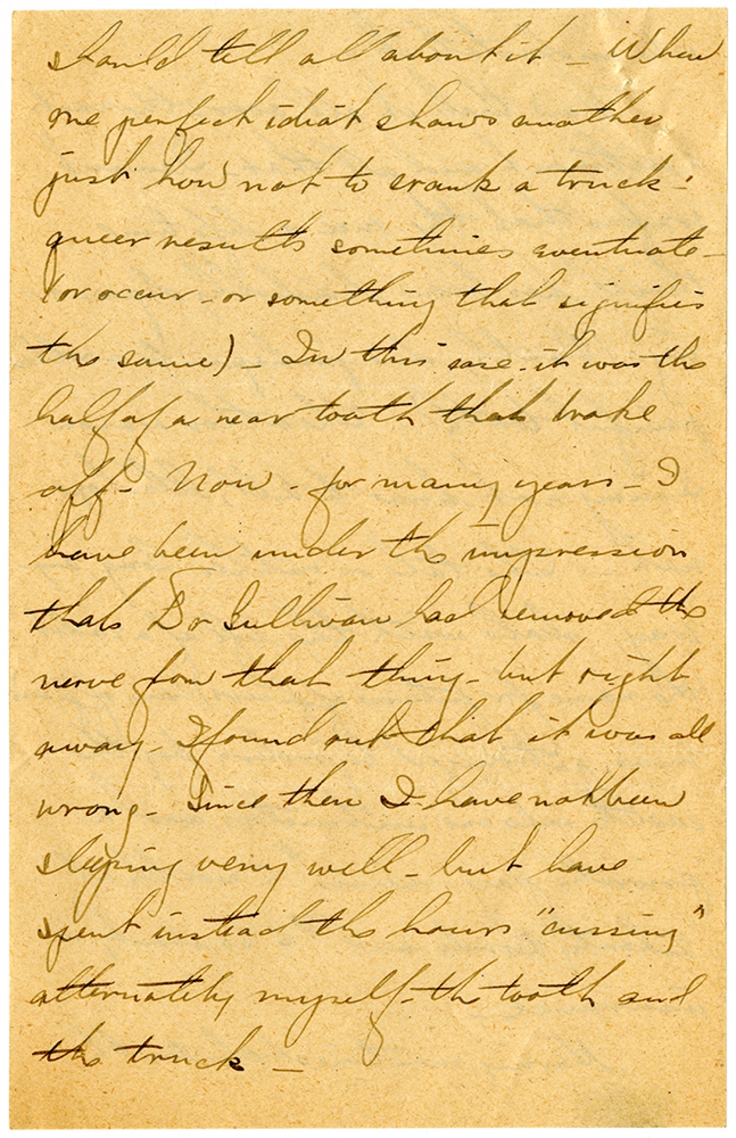 should tell all about it. When one perfect idiot shows another just how not to crank a truck - queer results sometimes eventuate (or occur - something that signifies the same). In this case it was the half of a rear tooth that broke off. Now - many years - I have been under the impression that Dr. Sullivan had removed the nerve from that thing - but right away - I found out that it was all wrong. Since then I have not been sleeping very well - but have spent instead the hours "cussing" alternately myself - the tooth and the truck.