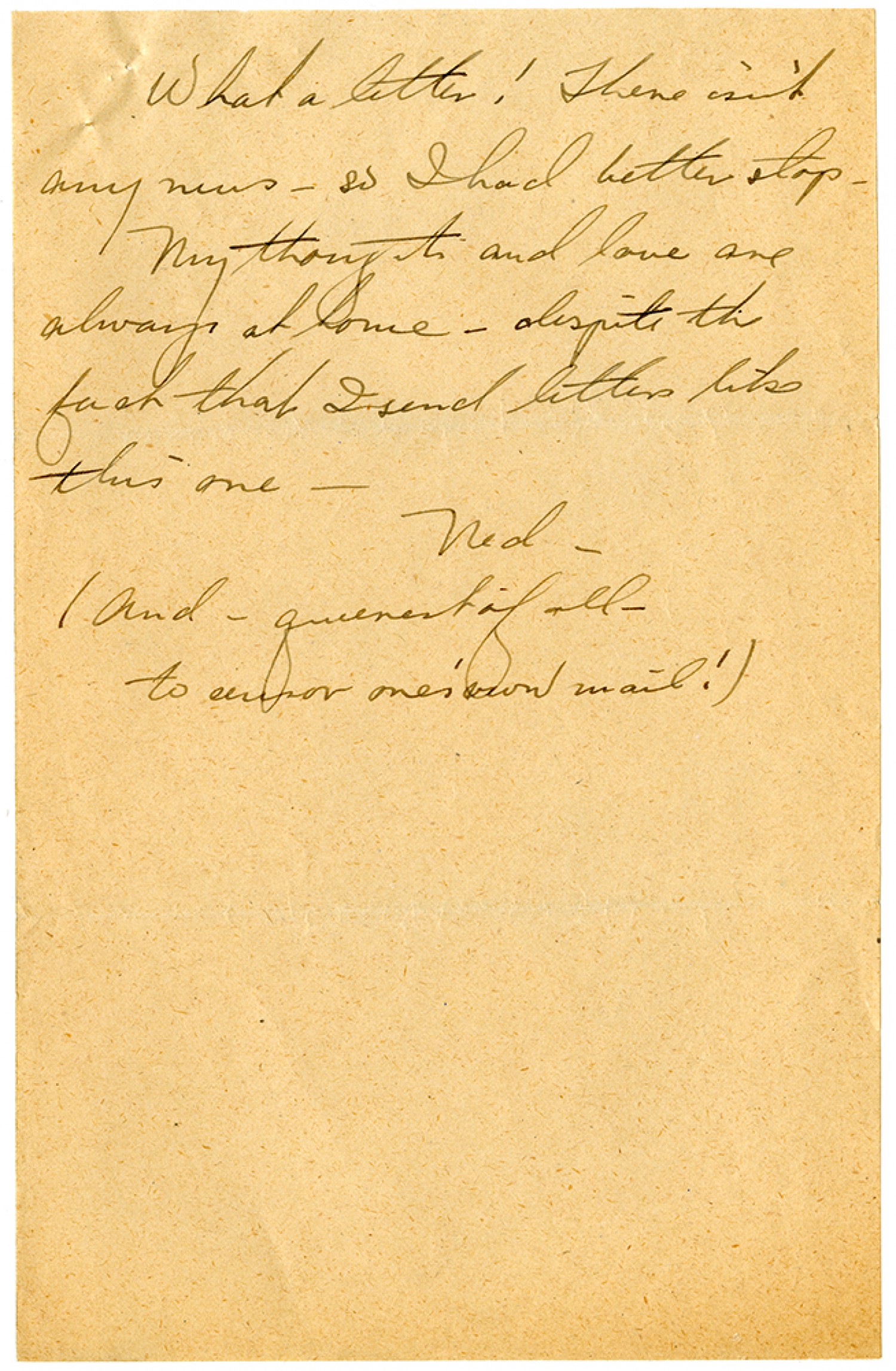 What a letter! There isn't any news - so had better stop. My thoughts and love are always at home - despite the fact that I send letters like this one. Ned. (And - queerest of all - to censor one's own mail!)