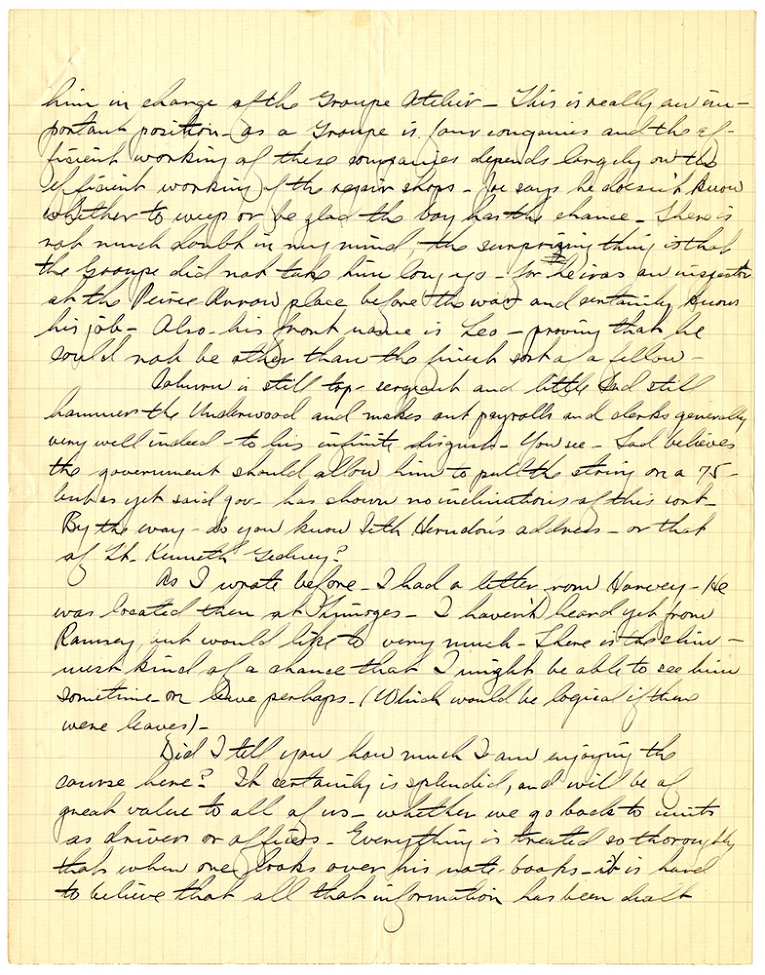 him in charge of the Groupe Atilier. This is really an important position - as a Groupe is four companies and the efficient working of these companies depends largely on the efficient working of the repair shops. Joe says he doesn't know whether to weep or be glad the boy has the chance. There is not much doubt in my mind, the surprising thing is that the Groupe did not take him long ago - for he was an inspector at the Peirce-Arrow place before the war and certainly knows his job. Also - his front name is Leo - proving that he could not be other than the finest sort of a fellow. Coburn is still top-sergeant and little Tad still hammers the Underwood and makes out payrolls and clerks generally very well indeed - to his infinite disgusts. You see - Tad believes the government should allow him to pull the string on a 75 - but as yet said gov. has shown no inclinations of this sort. By the way - do you know Seth Herndon's address - or that of Lt. Kenneth Gedney? As I wrote before - I had a letter from Harvey. He was located then at Limoges. I haven't heard yet from Ramsey but would like to very much. There is the slimmest kind of a chance that I might be able to see him sometime - or leave perhaps. (Which would be logical if there were leaves). Did I tell you how much I am enjoying the course here? It certainly is splendid, and will be of great value to all of us - whether we go back to units as drivers or officers. Everything is treated so thoroughly that when one looks over his note-books - it is hard to believe that all that information has been dealt
