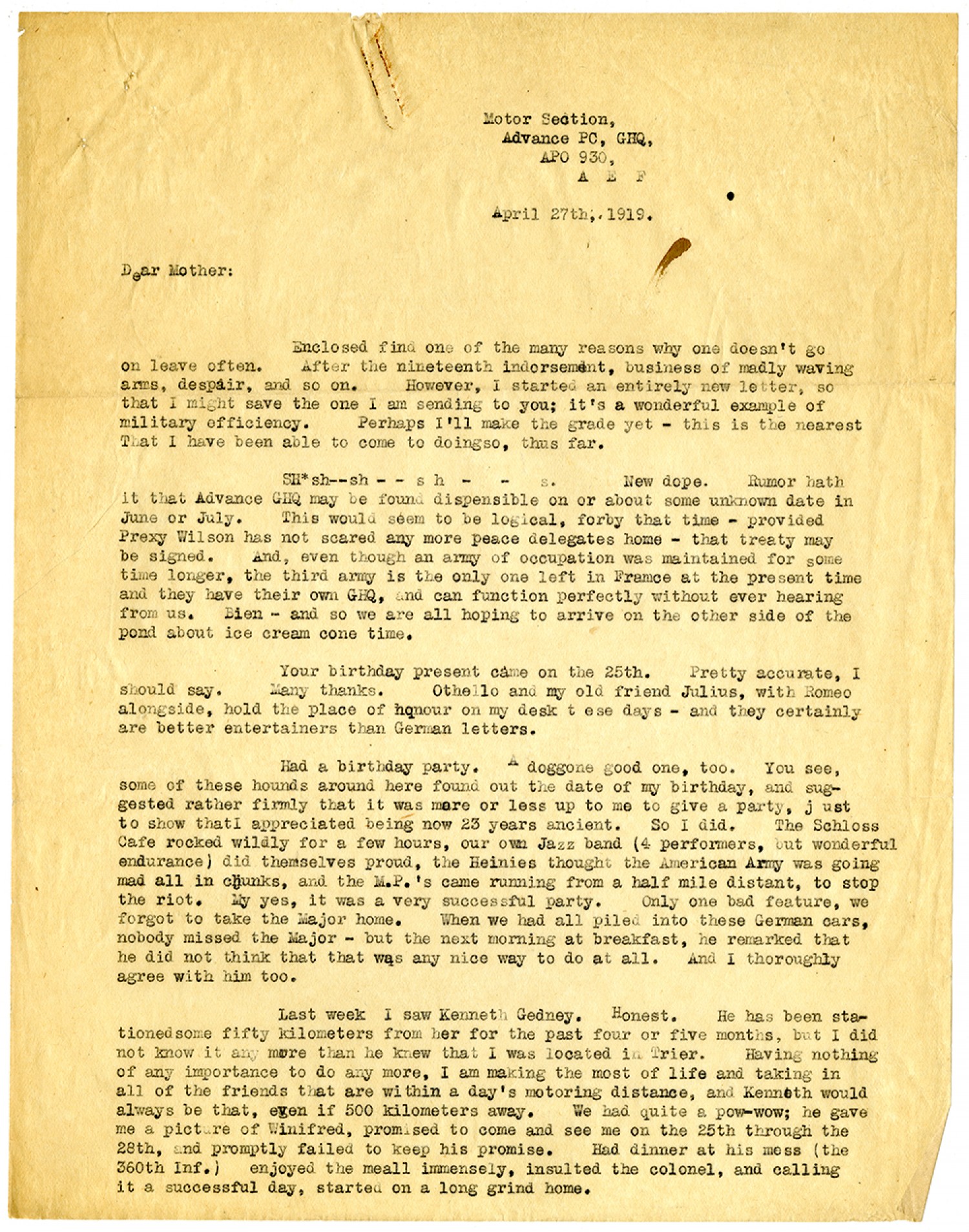 Motor Section, Advance PC, GHQ, APO 930, A E F April 27th, 1919. Dear Mother: Enclosed find one of the many reasons why one doesn't go on leave often. After the nineteenth indorsement, business of madly waving arms, despair, and so on. However, I started an entirely new letter, so that I might save the one I am sending to you; it's a wonderful example of military efficiency. Perhaps I'll make the grade yet - this is the nearest That I have been able to come to doing so, thus far. SH*sh--sh - - s h - - s. New dope. Rumor hath it that Advance GHQ may be found dispensible on or about some unknown date in June or July. This would seem to be logical, for by that time - provided Prexy Wilson has not scared any more peace delegates home - that treaty may be signed. And, even though an army of occupation was maintained for some time longer, the third army is the only one left in France at the present time and they have their own GHQ, and can function perfectly without ever hearing from us. Bien - and so we are all hoping to arrive on the other side of the pond about ice cream cone time. Your birthday present came on the 25th. Pretty accurate, I should say. Many thanks. Othello and my old friend Julius, with Romeo alongside, hold the place of honour on my desk these days - and they certainly are better entertainers than German letters. Had a birthday party. A doggone good one, too. You see, some of these hounds around here found out the date of my birthday, and suggested rather firmly that it was more or less up to me to give a party, just to some that I appreciated being now 23 years ancient. So I did. The Schloss Cafe rocked wildly for a few hours, our own Jazz band (4 performers, but wonderful endurance) did themselves proud, the Heinies thought the American Army was going mad all in chunks, and the M.P.'s came running from a half mile distant, to stop the riot. My yes, it was a very successful party. Only one bad feature, we forgot to take the Major home. When we had all piled into these German cars, nobody missed the Major - but the next morning at breakfast, he remarked that he did not think that that was any nice way to do at all. And I thoroughly agree with him too. Last week I saw Kenneth Gedney. Honest. He has been stationed some fifty kilometers from her for the past four or five months, but I did not know it any more than he knew that I was located in Trier. Having nothing of any importance to do any more, I am making the most of life and taking in all of the friends that are within a day's motoring distance, and Kenneth would always be that, even if 500 kilometers away. We had a quite a pow-wow; he gave me a picture of Winifred, promised to come and see me on the 25th through the 28th, and promptly failed to keep his promise. Had dinner at his mess (the 360th Inf.) enjoyed the meal immensely, insulted the colonel, and calling is a successful day, started on a long grind home.