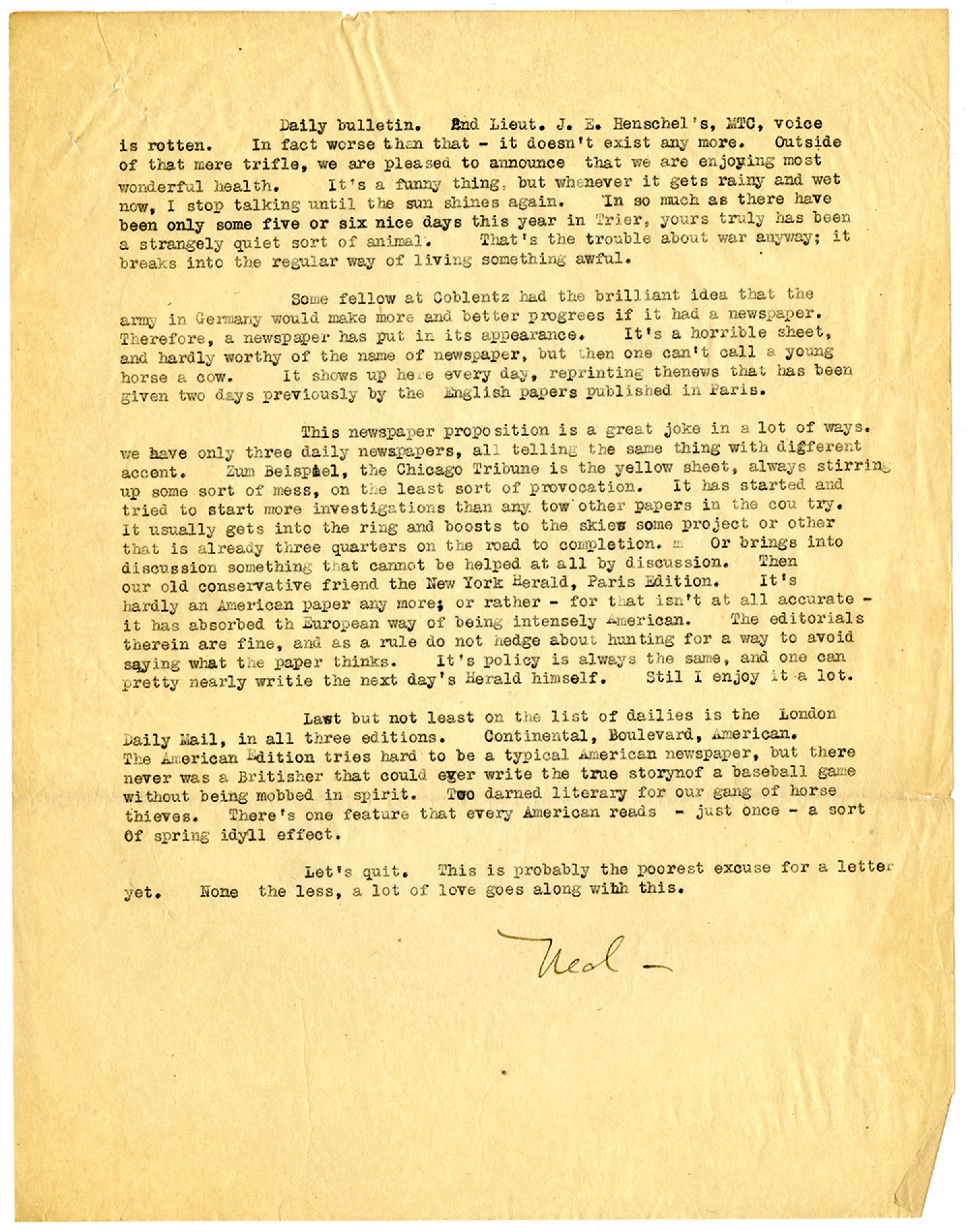 Daily bulletin. 2nd Lieut. J.E. Henschel's, MTC, voice is rotten. In fact worse than that - it doesn't exist any more. Outside of that mere trifle, we are pleased to announce that we are enjoying most wonderful health. It's a funny thing, but whenever it gets rainy and wet now, I stop talking until the sun shines again. In so much as there have been only some five or six nice days this year in Trier, yours truly has been a strangely quiet sort of animal. That's the trouble about war anyway; it breaks into the regular way of living something awful. Some fellow at [Coblenz] had the brilliant idea that the army in Germany would make more and better progrees if it had a newspaper. Therefore, a newspaper has put in its appearance. It's a horrible sheet, and hardly worthy of the name of newspaper, but then one can't call a young horse a cow. It shows up here every day, reprinting the news that has been given two days previously by the English papers published in Paris. This newspaper proposition is a great joke in a lot of ways. we have only three daily newspapers, all telling the same thing with different accent. Zum Beispiel, the Chicago Tribune is the yellow sheet, always stirring up some sort of mess, on the least sort of provocation. It has started and tried to start more investigations than any tow other papers in the country. It usually gets into the ring and boosts to the skies some project or other that is already three quarters on the road to completion. Or brings into discussion something that cannot be helped at all by discussion. Then our old conservative friend the New York Herald, Paris Edition. It's hardly an American paper any more; or rather - for that isn't at all accurate - it has absorbed th European way of being intensely American. The editorials therein are fine, and as a rule do not hedge about hunting for a way to avoid saying what the paper thinks. It's policy is always the same, and one can pretty nearly write the next day's Herald himself. Still I enjoy it a lot. Last but not least on the list of dailies is the London Daily Mail, in all three editions. Continental, Boulevard, American. The American Edition tries hard to be a typical American newspaper, but there never was a Britisher that could ever write the true story of a baseball game without being mobbed in spirit. Too darned literary for our gang of horse thieves. There's one feature that every American reads - just once - a sort of spring idyll effect. Let's quit. This is probably the poorest excuse for a letter yet. None the less, a lot of love goes along with this. Ned.