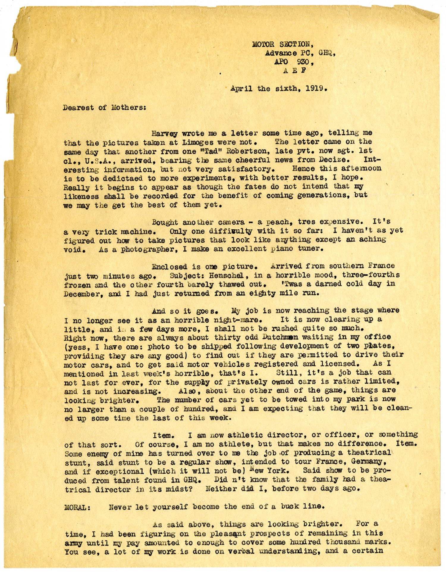 Motor Section, Advance PC, GHQ, APO 930, A E F April the sixth, 1919. Dearest of Mothers: Harvey wrote me a letter some time ago, telling me that the pictures taken at Limoges were not. The letter came on the same day that another from one "Tad" Robertson, late pvt. now sgt. 1st cl., U.S.A., arrived, bearing the same cheerful news from Decize. Interesting information, but not very satisfactory. Hence this afternoon is to be dedicated to more experiments, with better results, I hope. Really it begins to appear as though the fates to not intend that my likeness shall be recorded for the benefit of coming generations, but we may the get the best of them yet. Bought another camera - a peach, tres expensive. It's a very trick machine. Only one difficulty with it so far: I haven't as yet figured out how to take pictures that look like anything except an aching void. As a photographer, I make an excellent piano tuner. Enclosed is one picture. Arrived from southern France just two minutes ago. Subject: Henschel, in a horrible mood, three-fourths frozen and the other fourth barely thawed out. 'Twas a darned cold day in December, and I had just returned from an eighty mile run. And so it goes. My job is now reaching the stage where I no longer see it as an horrible night-mare. It is now clearing up a little, and in a few days more, I shall not be rushed quite so much. Right now, there are always about thirty odd Dutchmen waiting in my office (yess, I have one: photo to be shipped following development of two plates, providing they are any good) to find out if they are permitted to drive their motor cars, and to get said motor vehicles registered and licensed. As I mentioned in last week's horrible, that's I. Still, it's a job that can not last for ever, for the supply of privately owned cars is rather limited, and is not increasing. Also, about the other end of the game, things are looking brighter. The number of cars yet to be towed into my park is now no larger than a couple of hundred, and I am expecting that they will be cleaned up some time the last of this week. Item. I am now athletic director, or officer, or something of that sort. Of course, I am no athlete, but that makes no difference. Item. Some enemy of mine has turned over to me the job of producing a theatrical stunt, said stunt to be a regular show, intended to tour France, Germany, and if exceptional (which it will not be) New York. Said show to be produced from talent found in GHQ. Did n't know that the family had a theatrical director in its midst? Neither did I, before two days ago. MORAL: Never let yourself become the end of a buck line. As said above, things are looking brighter. For a time, I had been figuring on the pleasant prospects of remaining in this army until my pay amounted to enough to cover some hundred thousand marks. You see, a lot of my work is done on verbal understand, and a certain