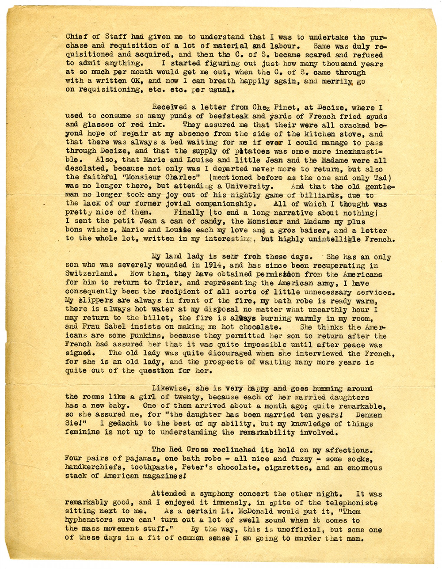 Chief of Staff had given me to understand that I was to undertake the purchase and requisition of a lot of material and labour. Same was duly requisitioned and acquired, and then the C. of S. became scared and refused to admit anything. I started figuring out just how many thousand years at so much per month would get me out, when the C. of S. came through with a written OK, and now I can breath happily again, and merrily go on requisitioning, etc. etc. per usual. Received a letter from Ches Pinet, at Decize, where I used to consume so many punds of beefsteak and yards of French fried spuds and glasses of red ink. They assured me that their were all cracked beyond hope of repair at my absence from the side of the kitchen stove, and that there was always a bed waiting for me if ever I could manage to pass through Decize, and that the supply of potatoes was once more inexhaustible. Also, that Marie and Louise and little Jean and the Madame were all desolated, because not only was I departed never more to return, but also the faithful "Monsieur Charles" (mentioned before as the one and only Tad) was no longer there, but attending a University. And that the old gentleman no longer took any joy out of his nightly game of billiards, due to the lack of our former jovial companionship. All of which I thought was pretty nice of them. Finally (to end a long narrative about nothing) I sen the petit Jean a can of candy, the Monsieur and Madame my plus bons wishes, Marie and Louise each my love and a gros baiser, and a letter to the whole lot, written in my interesting, but highly unintelligible French. My land lady is sehr froh these days. She has an only son who was severely wounded in 1914, and has since been recuperating in Switzerland. Now then, they have obtained permission from the Americans for him to return to Trier, and representing the American army, I have consequently been the recipient of all sorts of little unnecessary services. My slippers are always in front of the fire, my bath robe is ready warm, there is always hot water at my disposal no matter what unearthly hour I may return to the billet, the fire is always burning warmly in my room, and Frau Sabel insists on making me hot chocolate. She thinks the Americans are some punkins, because they permitted her son to return after the French had assured her that it was quite impossible until after peace was signed. The old lady was quite discouraged when she interviewed the French, for she is an old lady, and the prospects of waiting many more years is quite out of the question for her. Likewise, she is very happy and goes humming around the rooms like a girl of twenty, because each of her married daughters has a new baby. One of them arrived about a month ago; quite remarkable, so she assured me, for "the daughter has been married ten years! Denken Sie!" I gedacht to the best of my ability, but my knowledge of things feminine is not up to understanding the remarkability involved. The Red Cross reclinched its hold on my affections. Four pairs of pajamas, one bath robe - all nice and fuzzy - some sock, handerkerchiefs, toothpaste, Peter's chocolate, cigarettes, and an enormous stack of American magazines! Attended a symphony concert the other night. It was remarkably good, and I enjoyed it immensely, in spite of the telephoniste sitting next to me. As a certain Lt. McDonald would put it, "Them hyphenators sure can' turn out a lot of swell sound when it comes to the mass movement stuff." By the way, this is unofficial, but some one of these days in a fit of common sense I am going to murder that man.