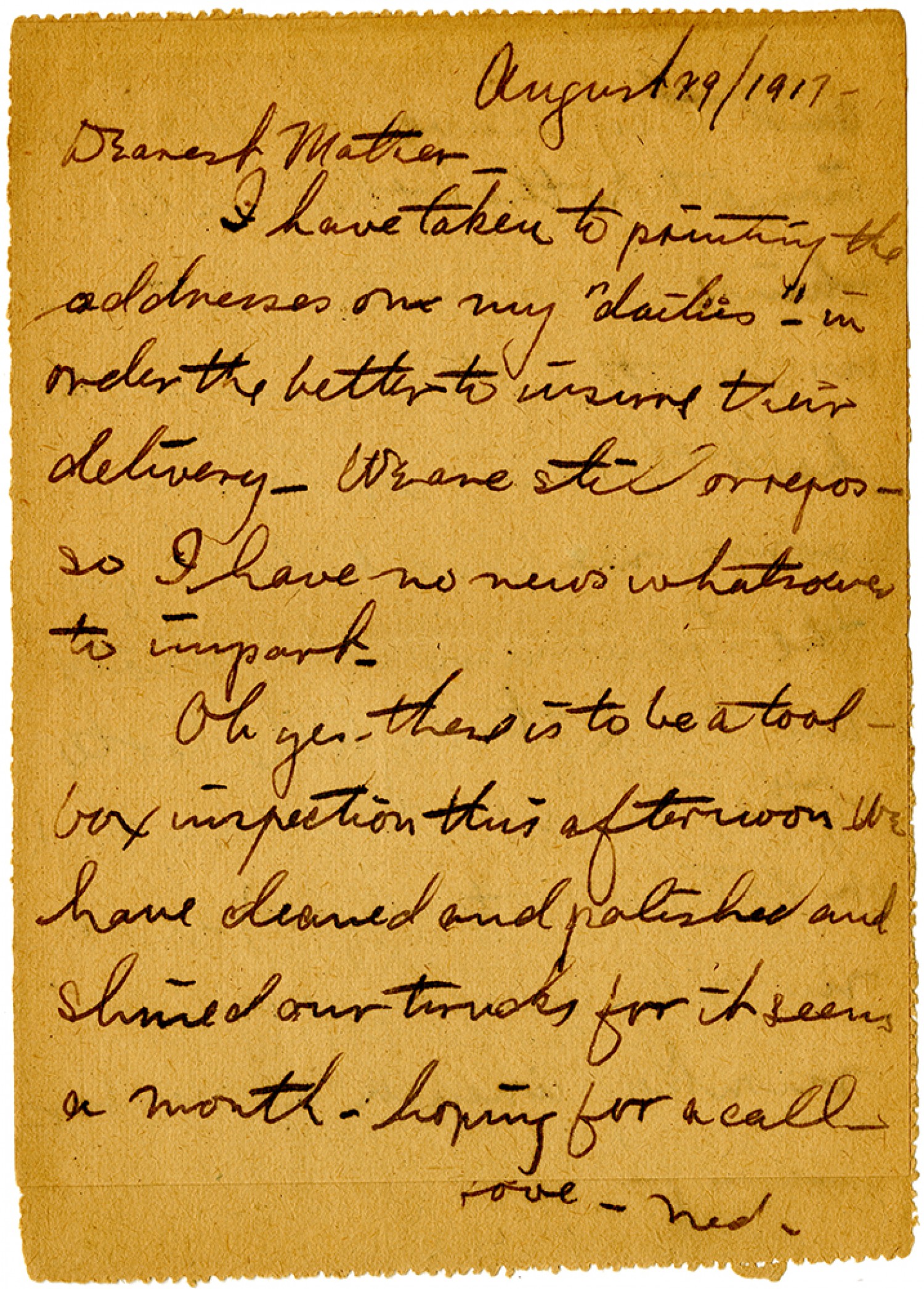 August 29/1917- Dearest Mother- I have taken to printing the addresses on my "dailies" - in order the better to insure their delivery. We are still on repos - so I have no news whatsoever to impart. Oh yes - there is to be a toolbox inspection this afternoon. We have cleaned and polished and shined our trucks for it seems month - hoping for a call