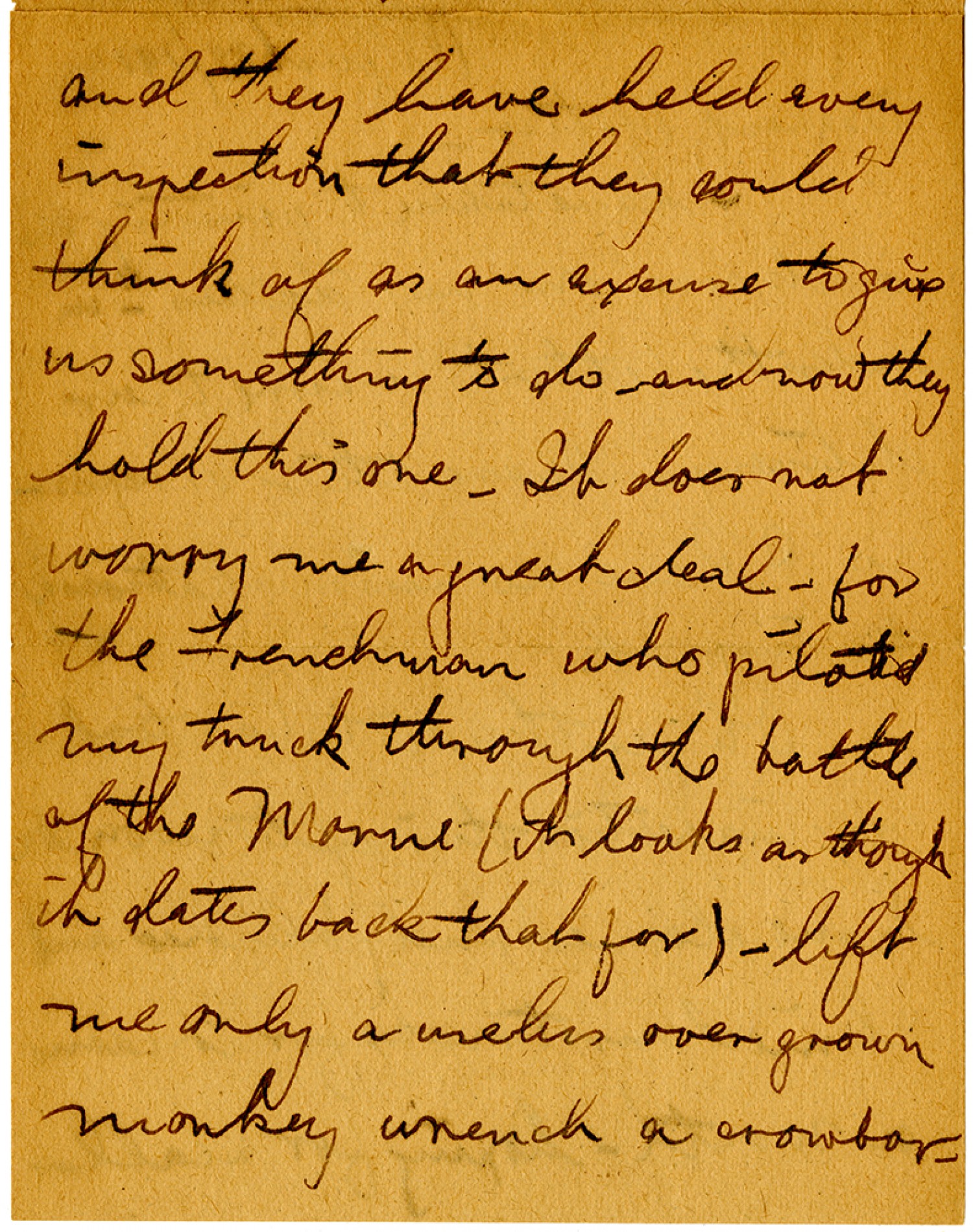 and they have held every inspection that they could think of as an excuse to give us something to do and now they hold this one. It does not worry me a great deal - for the Frenchman who piloted my truck through the battle of the Marne (it looks as though it dates back that far) - left me only a useless over grown monkey wrench a crowbar.