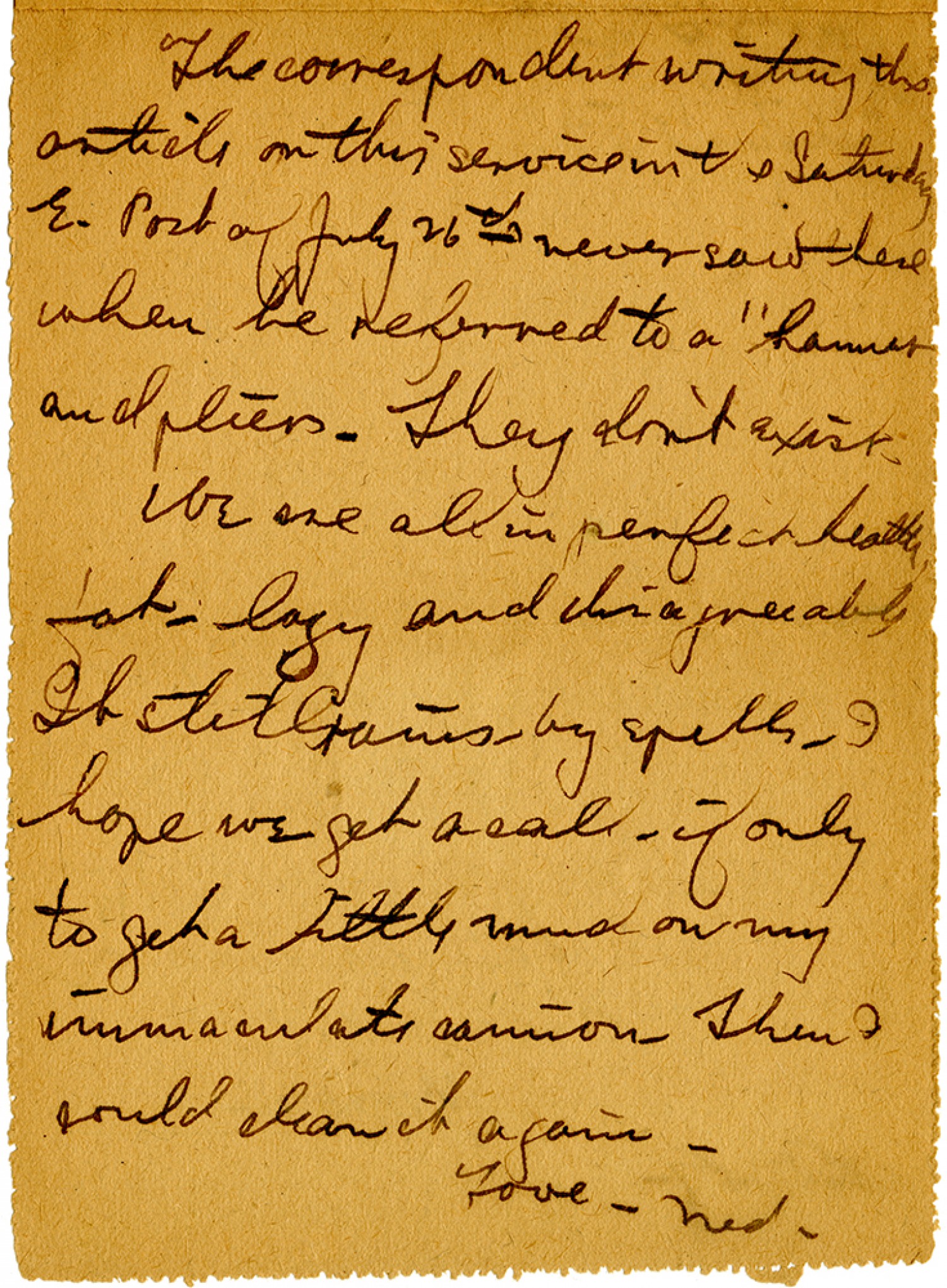 The correspondent writing the article on this service in the Saturday E. Post of July 26th never saw these when he referred to a "hammer and pliers. They don't exist. We are all in perfect health, fat, lacy and disagreeable. It still rains - by spells - I hope we get a call - if only to get a little mud on my immaculate camion. Then I could clean it again. Love - Ned.