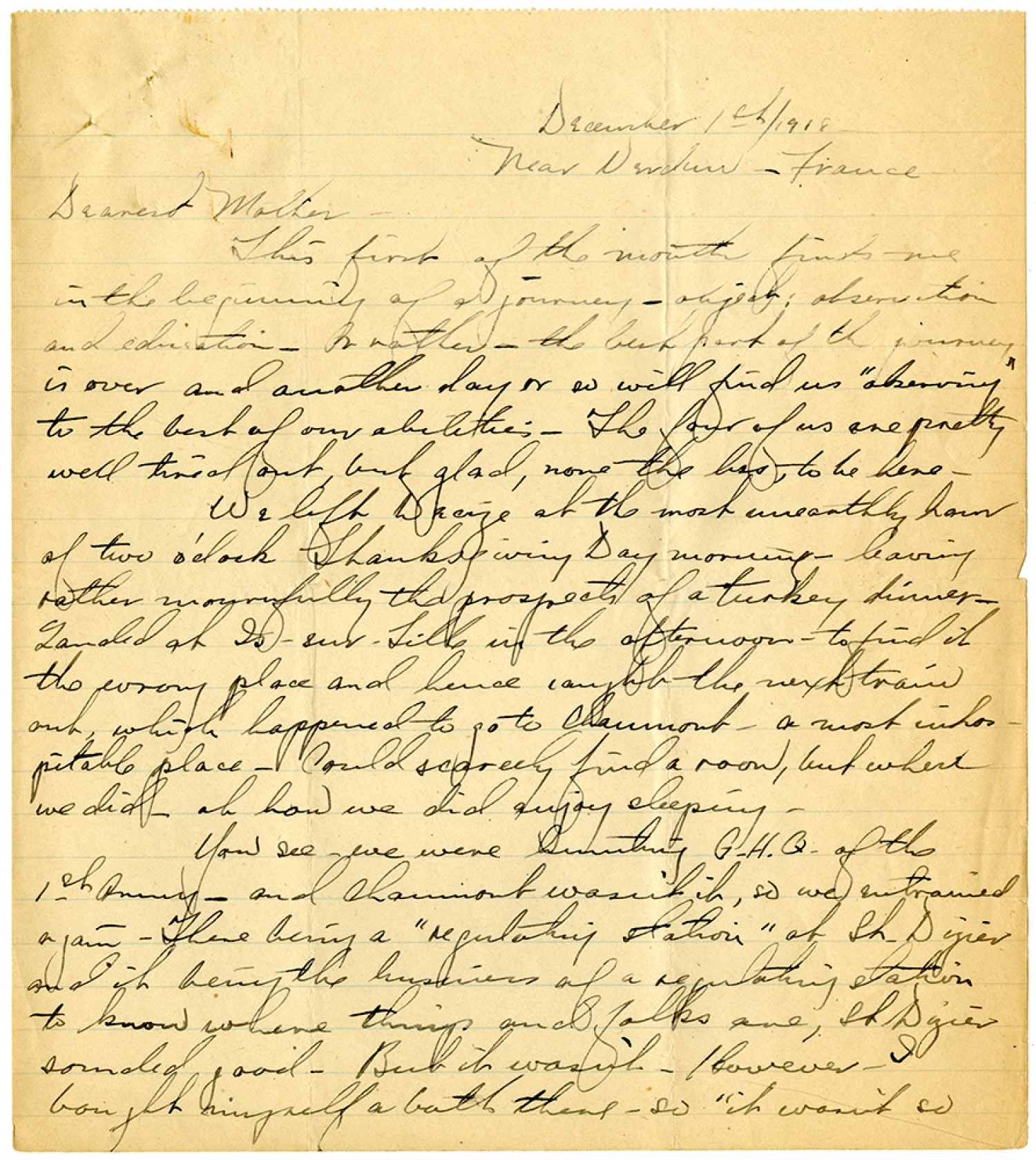 December 1st/1918 Near Verdun - France Dearest Mother - This first of the month finds me in the beginning of a journey - object: observation and education. Or rather - the best part of the journey is over and another day or so will find us "observing" to the best of our abilities. The four of us are pretty well tired out, but glad, none the less, to be here. We left Decize at the most unearthly hour of two o'clock Thanksgiving Day morning - leaving rather mournfully the prospects of a turkey dinner. Landed at Is-sur-Lille in the afternoon - to find it the wrong place and hence caught the next train out, which happened to go to Chaumont - a most inhospitable place. Could scarcely find a room, but when we did - at how we did enjoy sleeping. You see - we were hunting G.H.Q. of the 1st Army - and Chaumont wasn't it, so we entrained again. There being a "regulating station" at St. Dizier and it being the business of a regulating station to know where things and folks are, St. Dizier sounded good. But it wasn't. However - I bought myself a bath there - so "it wasn't so