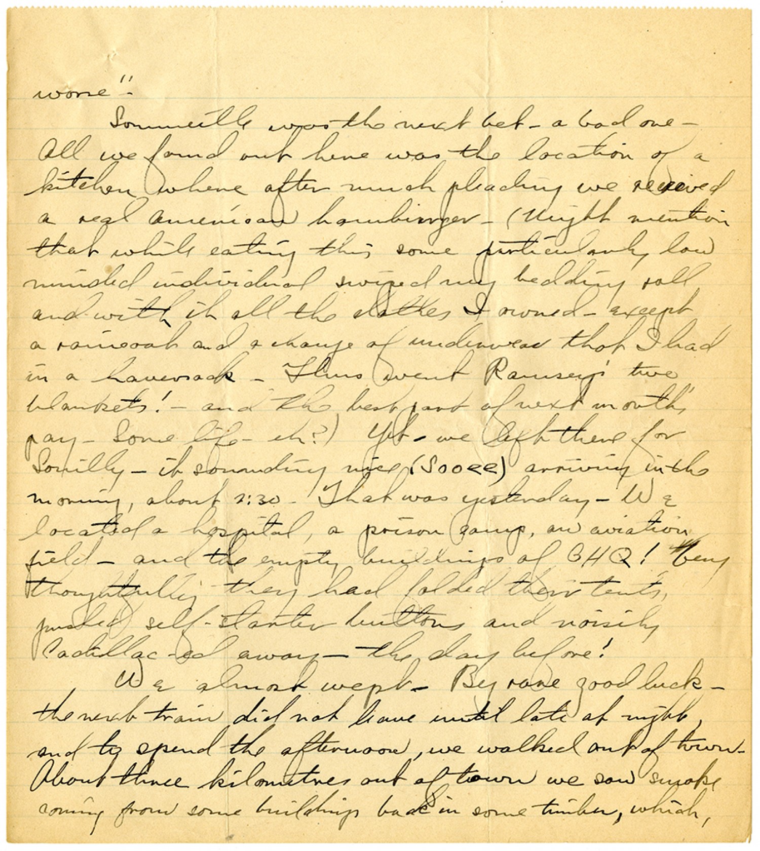 worse". Somerville was the next bet - a bad one. All we found out here was the location of a kitchen where after much pleading we received a real American hamburger - (might mention that while eating this some particularly low minded individual swiped my bedding roll and with it all the clothes I owned - except a raincoat and a change of underwear that I had in a haversack. Thus went Ramsey's two blankets! - and the best part of next month's pay. Some life - eh?) Yet - we left there for Souilly - it sounding nice (Sooee) arriving in the morning, about 2:30. That was yesterday. We located a hospital, a prison camp, an aviation field - and the empty buildings of GHQ! being thoughtfully they had folded their tents, pushed self-starter buttons and noisily Cadillac-ed away - the day before! We almost wept. By rare good luck - the next train did not leave until late at night, and to spend the afternoon, we walked out of town - About three kilometres out of town we saw smoke coming from some buildings back in some timber, which,