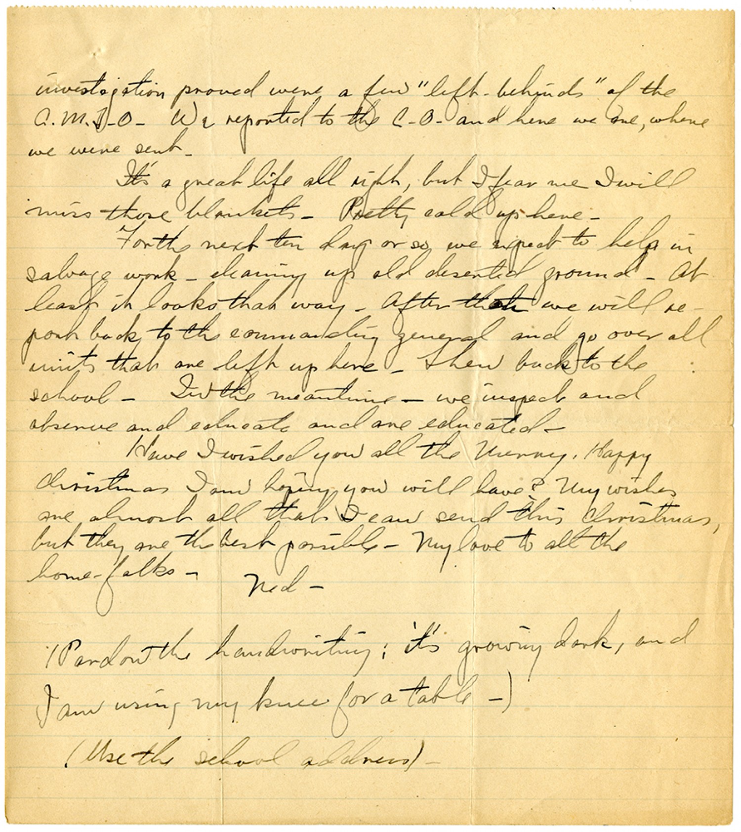 investigation proved were a few "left-behinds" of the C.M.T.O. We reported to the C.O. and here we are, where we were sent. It's a great life all right, but I fear me I will miss those blankets. Pretty cold up here. For the next ten days or so we expect to help in salvage work - cleaning up old deserted ground. At least it looks that way. After that we will report back to the commanding general and go over all units that are left up here. Then back to the school. In the meantime - we inspect and observe and educate and are educated. Have I wished you all the Merry, Happy Christmas I am hoping you will have? My wishes are almost all that I can send this Christmas, but they are the best possible. My love to all the home-folks. Ned. (Pardon the handwriting; it's growing dark, and I am using my knee for a table-) (Use the school address)-