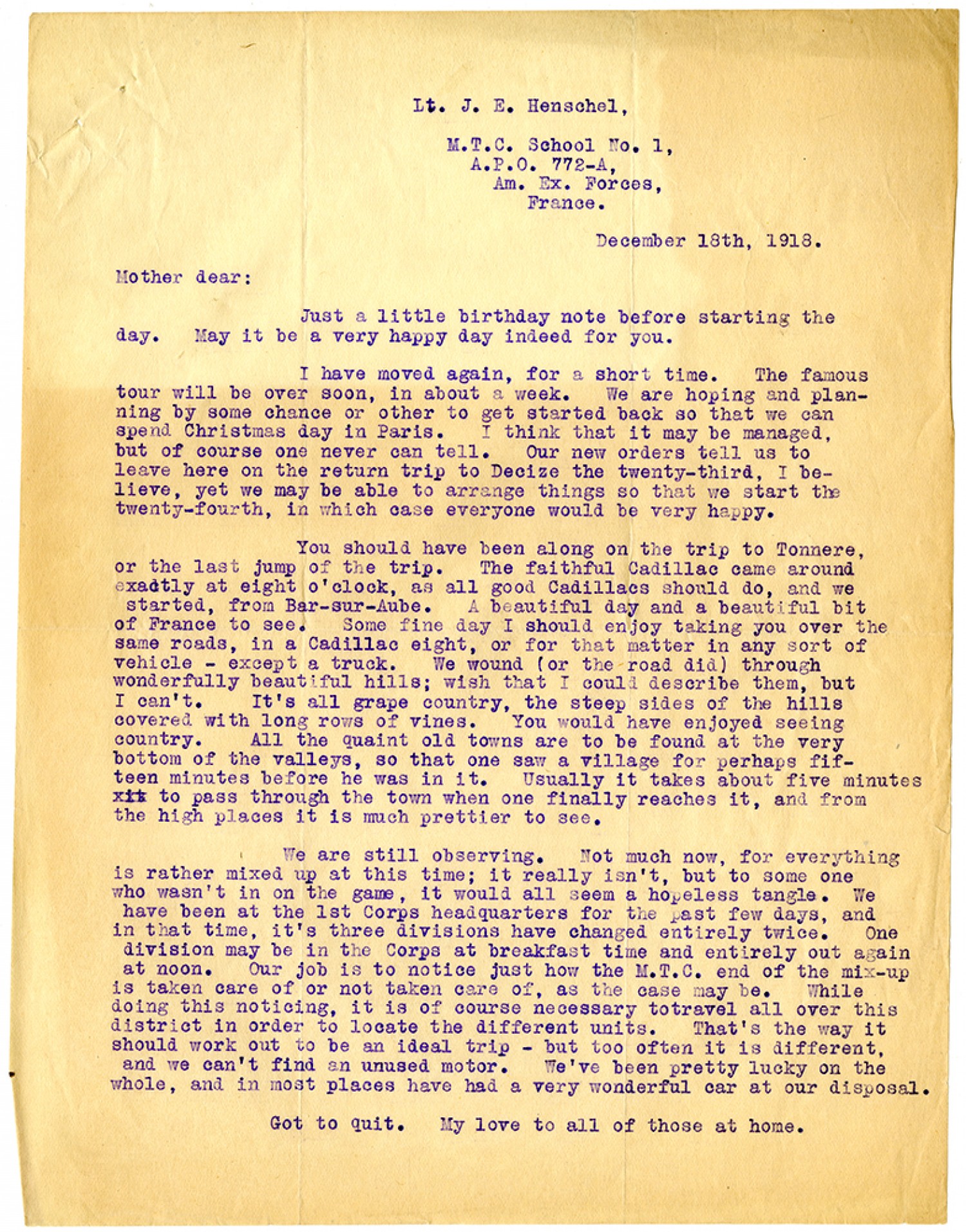 Lt. J.E. Henschel M.T.C. School No. 1, A.P.O. 772-A, Am. Ex. Forces, France. December 18th, 1918. Mother dear: Just a little birthday note before starting the day. May it be a very happy day indeed for you. I have moved again, for a short time. The famous tour will be over soon, in about a week. We are hoping and planning by some chance or other to get started back so that we can spend Christmas day in Paris. I think that it may be managed, but of course one never can tell. Our new orders tell us to leave here on the return trip to Decize the twenty-third, I believe, yet we may be able to arrange things so that we start the twenty-fourth, in which case everyone would be very happy. You should have been along on the trip to Tonnere, or the last jump of the trip. The faithful Cadillac came around exactly at eight o'clock, as all good Cadillacs should do, and we started, from Bar-sur-Aube. A beautiful day and a beautiful bit of France to see. Some fine day I should enjoy taking you over the same roads, in a Cadillac eight, or for that matter in any sort of vehicle - except a truck. We wound (or the road did) through wonderfully beautiful hills; wish that I could describe them, but I can't. It's all grape country, the steep sides of the hills covered with long rows of vines. You would have enjoyed seeing country. All the quaint old towns are to be found at the very bottom of the valleys, so that one saw a village for perhaps fifteen minutes before he was in it. Usually it takes about five minutes to pass through the town when one finally reaches it, and from the high places it is much prettier to see. We are still observing. Not much now, for everything is rather mixed up at this time; it really isn't, but to some one who wasn't in on the game, it would all seem a hopeless tangle. We have been at the 1st Corps headquarters for the past few days, and in that time, it's three divisions have changed entirely twice. One division may be in the Corps at breakfast time and entirely out again at noon. Our job is to notice just how the M.T.C. end of the mix-up is taken care of or not taken care of, as the case may be. While doing this noticing, it is of course necessary to travel all over this district in order to locate the different units. That's the way it should work out to be an ideal trip - but too often it is different, and we can't find an unused motor. We've been pretty lucky on the whole, and in most places have had a very wonderful car at our disposal. Got to quit. My love to all of those at home.