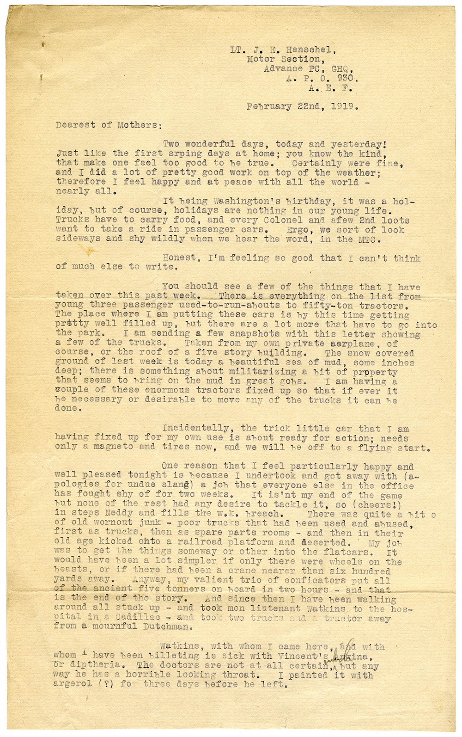 Lt. J.E. Henschel, Motor Section, Advance PC, GHQ, A.P.O. 930, A.E.F. February 22nd, 1919. Dearest of Mothers: Two wonderful days, today and yesterday! Just like the first spring days at home; you know the kind, that make one feel too good to be true. Certainly were fine, and I did a lot of pretty good work on top of the weather; therefore I feel happy and at peace with all the world - nearly all. It being Washington's birthday, it was a holiday, but of course, holidays are nothing in our young life. Trucks have to carry food, and every Colonel and a few 2nd loots went to take a ride in passenger cars. Ergo, we sort of look sideways and shy wildly when we hear the word, in the MTC. Honest, I'm feeling so good that I can't think of much else to write. You should see a few of the things that I have taken over this past week. There is everything on the list from young three passenger used-to-run-abouts to fifty-ton tractors. The place where I am putting these cars is by this time getting pretty well filled up, but there are a lot more that have to go into the park. I am sending a few snapshots with this letter showing a few of the trucks. Taken from my own private aerplane, of course, or the roof of a five story building. The snow covered ground of last week is today a beautiful sea of mud, some inches deep; there is something about militarizing a bit of property that seems to bring mud in great gobs. I am having a couple of these enormous tractors fixed up so that if ever it be necessary or desirable to move any of the trucks it can be done. Incidentally, the trick little car that I am having fixed up for my own use is about ready for action; needs only a magneto and tires now, and we will be off to a flying start. One reason that I feel particularly happy and well pleased tonight is because I undertook and got away with (apologies for undue slang) a job that everyone else in the office has fought shy of for two weeks. It is'nt my end of the game but none of the rest had any desire to tackle it, so (cheers!) in steps Neddy and fills the w.k. breach. There was quite a bit o of old wornout junk - poor trucks that had been used and abused, first as trucks, then as spare parts rooms - and then in their old age kicked onto a railroad platform and deserted. My job was to get the things someway or other into the flatcars. It would have been a lot simpler if only there were wheels on the beasts, or if there had been a crane nearer than six hundred yards away. Anyway, my valient trio of conficators put all of the ancient five tonners on board in two hours - and that is the end of the story. And since then I have been walking around all stuck up - and took mon liutenant Watkins to the hospital in a Cadillac - and took two trucks and a tractor away from a mournful Dutchman. Watkins, with whom I came here, and with whom I have been billeting is sick with Vincent's Angina, or diptheria. The doctors are not at all certain [ms illegible: 1 wd], but any way he has a horrible looking throat. I painted it with argerol (?) for three days before he left.