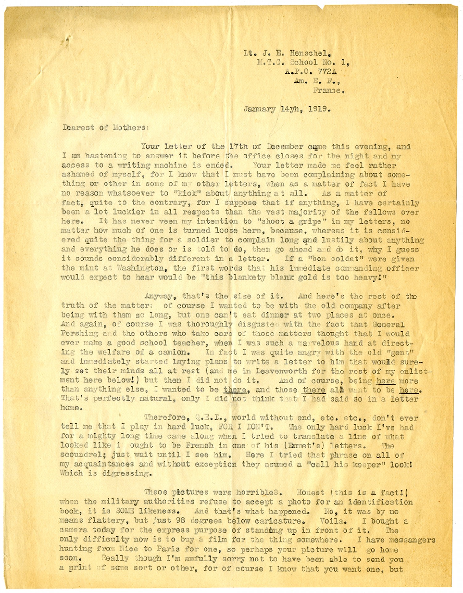 Lt. J.E.Henschel, M.T.C. School No. 1, A.P.O. 772A Am. E. F., France. January 14th, 1919. Dearest of Mothers: Your letter of the 17th of December came this evening, and I am hastening to answer it before the office closes for the night and my access to a writing machine is ended. Your letter made me feel rather ashamed of myself, for I know that I must have been complaining about something or other in some of my other letters, when as a matter of fact I have no reason whatsoever to “kick” about anything at all. As a matter of fact, quite to the contrary, for I suppose that if anything, I have certainly been a lot luckier in all respects than the vast majority of the fellows over here. It has never been my intention to "shoot a gripe" in my letters, no matter how much of one is turned loose here, because, whereas it is considered quite the thing for a soldier to complain long and lustily about anything and everything he does or is told to do, then go ahead and do it, why I guess it sounds considerably different in a letter. If a "bon soldat" were given the mint at Washington, the first words that his immediate commanding officer would expect to hear would be "this blankety blank gold is too heavy!" Anyway, that's the size of it. And here's the rest of the truth of the matter: of course I wanted to be with the old company after being with them so long, but one can't eat dinner at two places at once. And again, of course I was thoroughly disgusted with the fact that General [John] Pershing and the others who take care of those matters thought that I would ever made a good school teacher, when I was such a marvelous hand at directing the welfare of a camion. In fact I was quite angry with the old "gent" and immediately started laying plans to write a letter to him that would surely set their minds all at rest (and me in Leavenworth for the rest of my enlistment here below!) but then I did not do it. And of course, being here more than anything else, I wanted to be there, and those there all want to be here. That's perfectly natural, only I did not think that I had said so in a letter home. Therefore, Q.E.D., world without end, etc. etc., don't ever tell me that I play in hard luck, FOR I DON'T. The only hard luck I've had for a mighty long time came along when I tried to translate a line of what looked like i ought to be French in one of his (Emmet's) letters. The scoundrel; just wait until I see him. Here I tried that phrase on all of my acquaintances and without exception they assumed a "call his keeper" look! Which is digressing. Those pictures were horrible. Honest (this is a fact!) when the military authorities refuse to accept a photo for an identification book, it is SOME likeness. And that's what happened. No, it was by no means flattery, but just 98 degrees below caricature. Voila. I bought a camera today for the express purpose of standing up in front of it. The only difficulty now is to buy a film for the thing somewhere. I have messengers hunting from Nice to Paris for one, so perhaps your picture will go home soon. Really though I'm awfully sorry not to have been able to send you a print of some sort of other, for of course I know that you want one, but