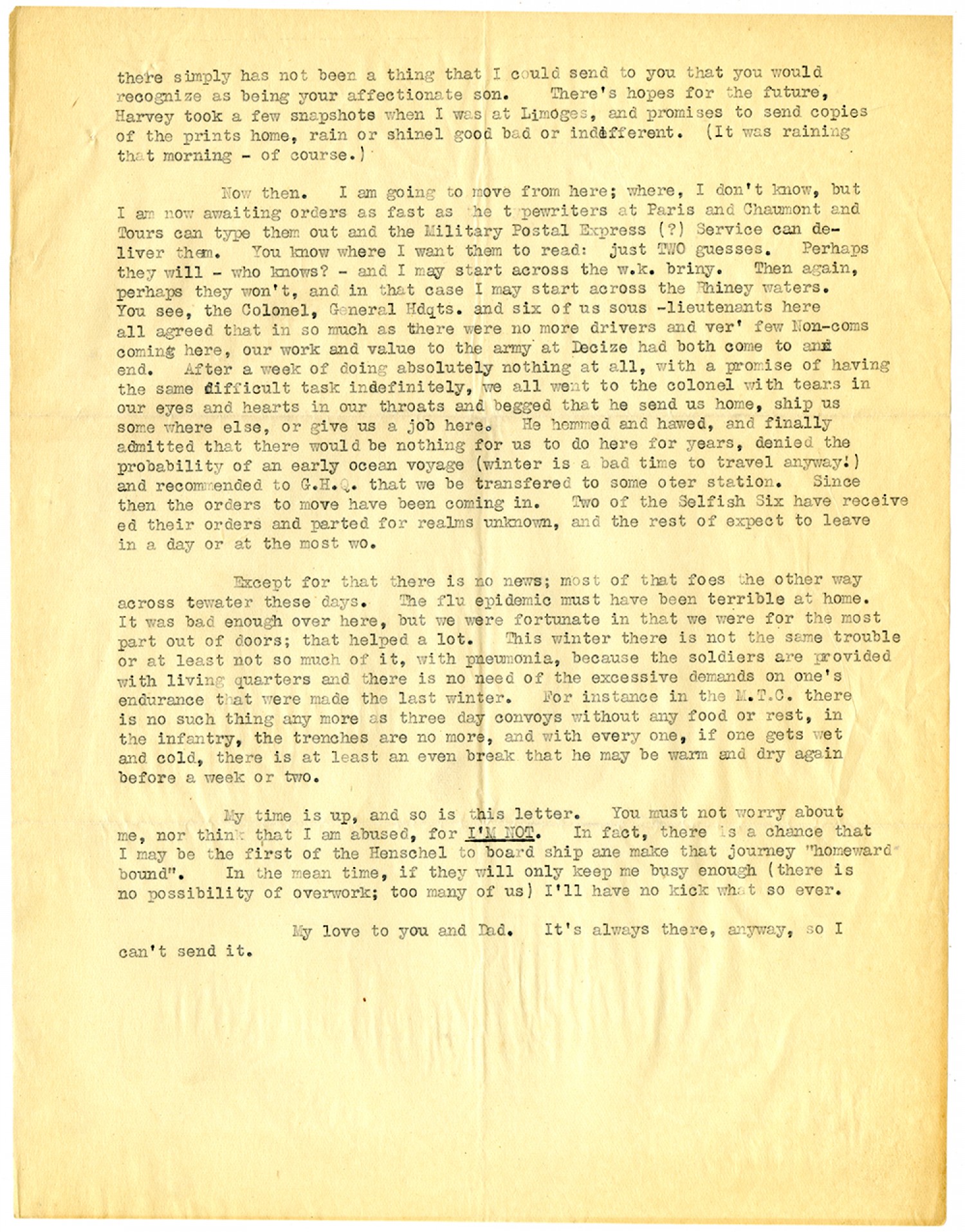 there simply has not been a thing that I could send to you that you would recognize as being your affectionate son. There's hopes for the future, Harvey took a few snapshots when I was at Limoges, and promises to send copies of the prints home, rain or shine good bad or indifferent. (It was raining that morning - of course.) Now then. I am going to move from here; where, I don't know, but I am now awaiting orders as fast as the typewriters at Paris and Chaumont and Tours can type them out and the Military Postal Express (?) Service can deliver them. You know where I want them to read: just TWO guesses. Perhaps they will - who knows? - and I may start across the w.k. briny. Then again, perhaps they won't, and in that case I may start across the Rhiney waters. You see, the Colonel, General Hdqts. and six of us sous -lieutenants here all agreed that in so much as there were no more drivers and ver' few Non-coms coming here, our work and value to the army at Decize had both come to an end. After a week of doing absolutely nothing at all, with a promise of having the same difficult task indefinitely, we all went to the colonel with tears in our eyes and hearts in our throats and begged that he send us home, ship us some where else, or give us a job here. He hemmed and hawed, and finally admitted that there would be nothing for us to do here for years, denied the probability of an early ocean voyage (winter is a bad time to travel anyway.) and recommended to G.H.Q. that we be transfered to some other station. Since then the orders to move have been coming in. Two of the Selfish Six have received their orders and parted for realms unknown, and the rest of expect to leave in a day or at the most two. Except for that there is no news; most of that foes the other way across te water these days. The flu epidemic must have been terrible at home. It was bad enough over here, but we were fortunate in that we were for the most part out of doors; that helped a lot. This winter there is not the same trouble or at least not so much of it, with pneumonia, because the soldiers are provided with living quarters and there is no need of the excessive demands on one's endurance that were made the last winter. For instance in the M.T.C. there is no such thing any more as three day convoys without any good or rest, in the infantry, the trenches are no more, and with every one, if one gets wet and cold, there is at least an even break that he may be warm and dry again before a week or two. My time is up, and so is this letter. You must not worry about me, nor think that I am abused, for I'M NOT. In fact, there is a chance that I may the first of the Henschel to board ship and make that journey "homeward bound". In the mean time, if they will only keep me busy enough (there is no possibility of overwork; too many of us) I'll have no kick what so ever. My love to you and Dad. It's always there, anyway, so I can't send it.