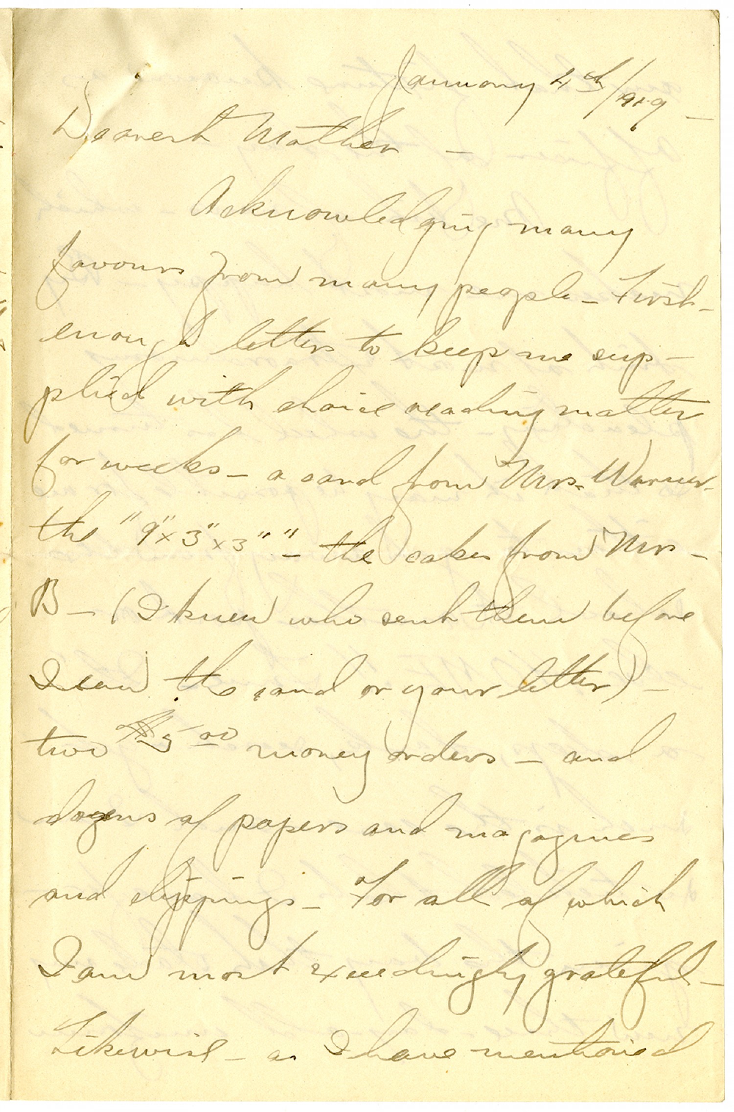 January 4th/1919 - Dearest Mother - Acknowledging many favours from many people. First - enough letters to keep me supplied with choice reading matter for weeks - a card from Mrs. Warner, the "9x3x3" - the cakes from Mr. B- (I knew who sent them before I saw the card or your letter) - two $5.00 money orders - and dozens of papers and magazines and clippings. For all of which I am most exceedingly grateful. Likewise - as I have mentioned