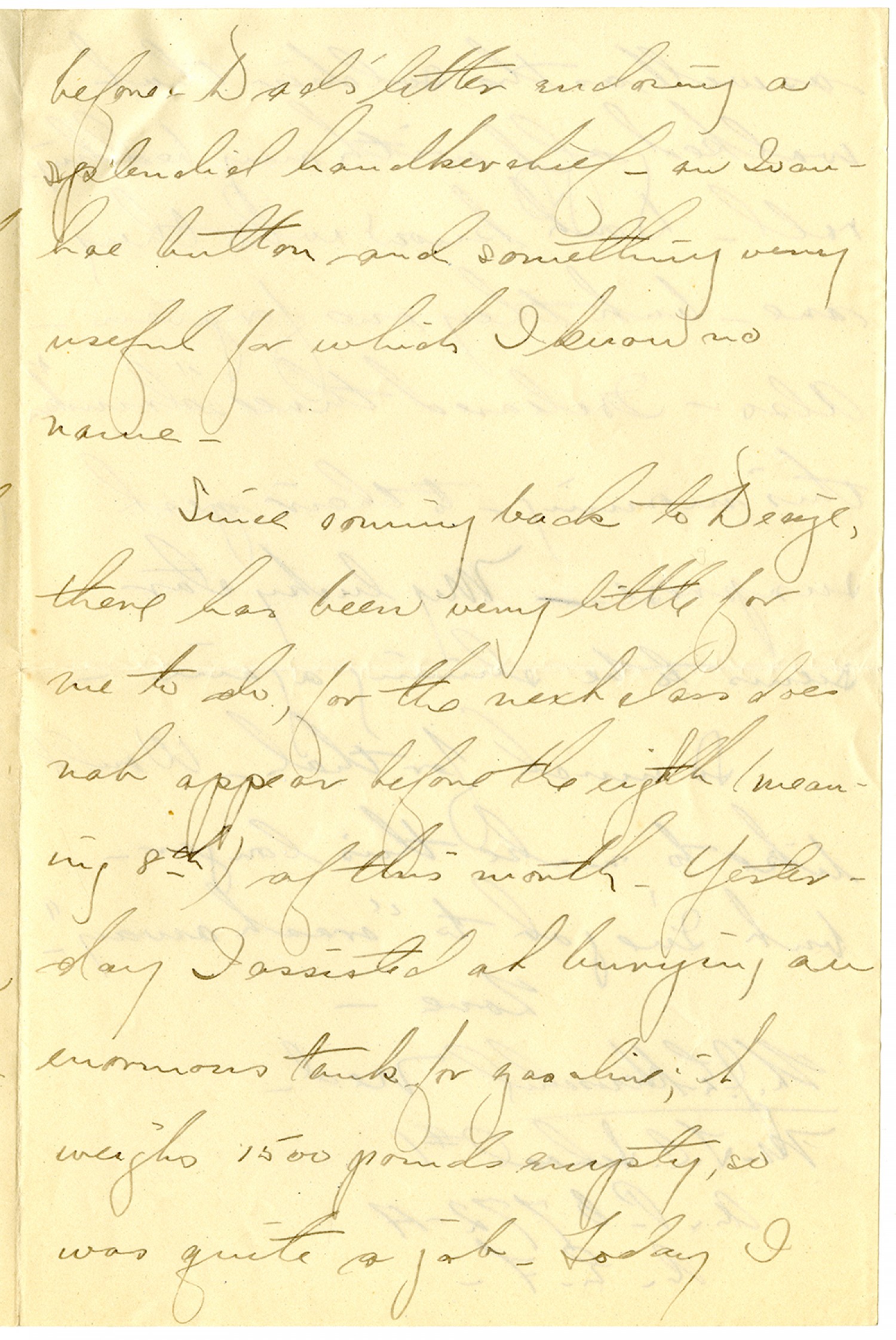 before Dad's letter enclosing a splendid handkerchief - an Ivanhoe button and something very useful for which I know no name. Since coming back to Decize, there has been very little for me to do, for the next class does not appear before the eighth (meaning 8th) or this month. Yesterday, I assisted at burying, an enormous tank for gasoline; it weighs 1500 pounds empty, so was quite a job. Today I