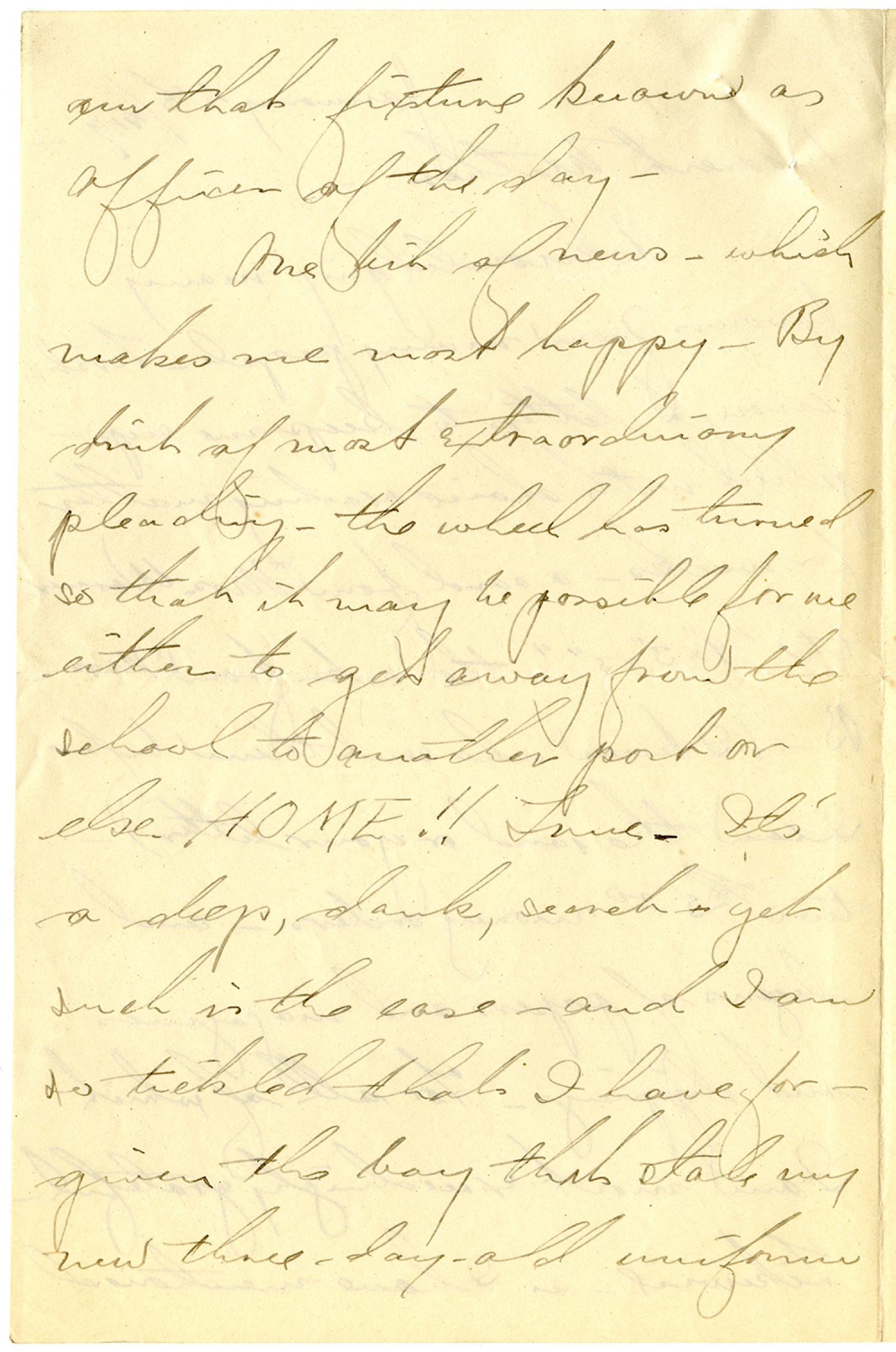 am that fixture known as officer of the day. One bit of news - which makes me most happy. By [ms illegible: 1 wd] of most extraordinary pleading - the wheel has turned so that it may be possible for me either to get away from the school to another port or else HOME!! True - It's a deep, dark, secret - yet such is the case - and I am so tickled that I have forgiven the boy that stole my new three-day-old uniform