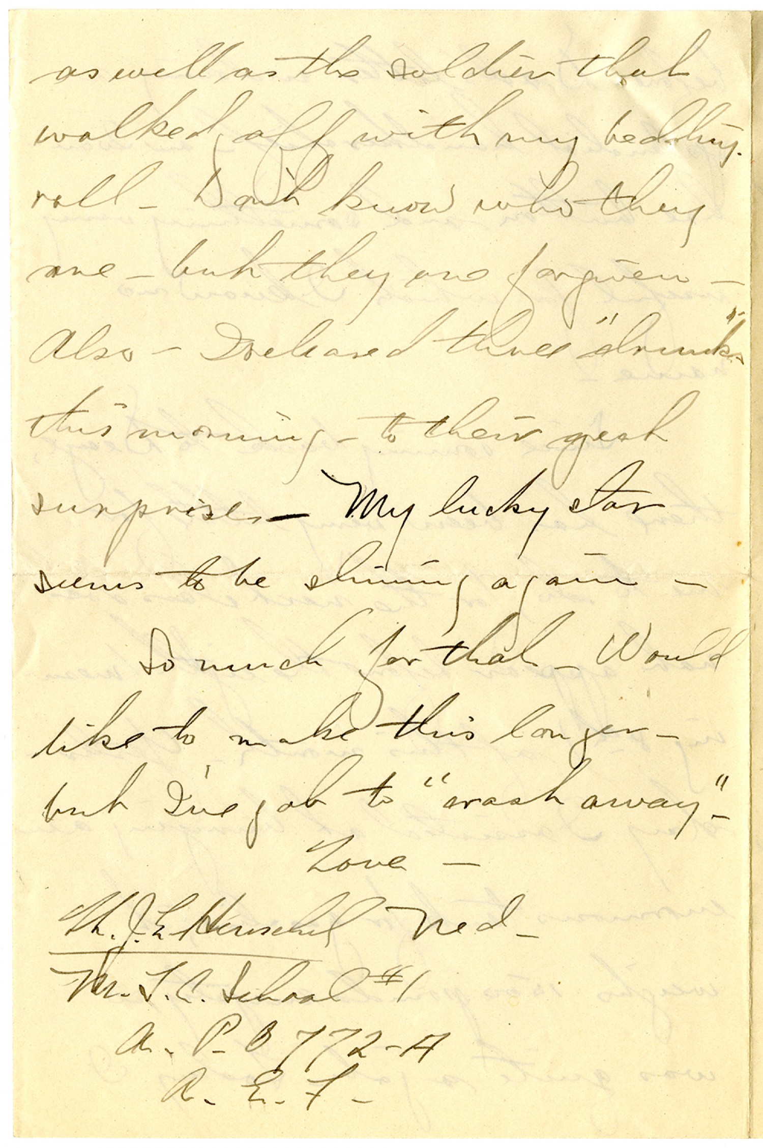 as well as the soldier that walked off with my bedding roll. Don't know who they are - but they are forgiven. Also - I released three "drunks" this morning - to their great surprise. My lucky star seems to be shinning again. So much for that. Would like to make this longer - but I've got to "crash away". Love- Ned. Lt. J.E. Henschel M.T.C. School #1 A.P.O. 772-A A.E.F.