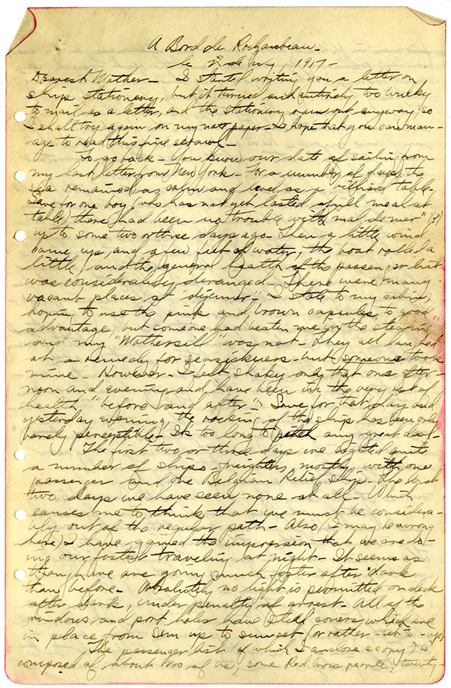 A Bord de Rochambeau le 2 de July, 1917 - Dearest Mother- I started writing you a letter on ship stationary, but it turned out entirely too bulky to mail as a letter, and the stationary ran out anyway so I shall try again on my note paper. Do hope that you can manage to read this fine scrawl. To go back - You know our date of sailing from my last letter from New York. For a number of days the sea remained as calm and level as a billiard table. Save for one boy (who has not yet lasted a full meal at table) there had been no trouble with "mal de mer" (?) up to some two or three days ago. Then a little wind came up, and a few feet of water, the boat rolled a little and the general health of the passenger but was considerably deranged. There were many vacant places at "dinner". I stole to my cabin, hoping to use the pink and brown capsules to good advantage, but come one had beaten me in the "stealing" and my "Mothersill" was not. They all laughed at a remedy for seasickness, but someone took mine. However, I felt shaky only that one afternoon and evening and have been in the very best of health "before and after". Save for that day and yesterday evening, the rocking of the ship has been only barely perceptible. It's too long to pitch any great deal. The first two or three days we sighted quite a number of ships, freighters, mostly, with one passenger and one Belgian Relief ship. The last two days we have seen none at all. Which causes me to think that we must be considerably out of the regular path. Also (I may be wrong here) I have gained the impression that we are doing our faster traveling at night. It seems as though we are going much faster after dark than before. Absolutely no light is permitted on deck after dark, under penalty of arrest. All of the windows and port holes have stiff covers which are in place from sun up to sun set (or rather-set to-up). The passenger list (of which I enclose a copy) is composed of about 200 of us, some Red Cross people, twenty-