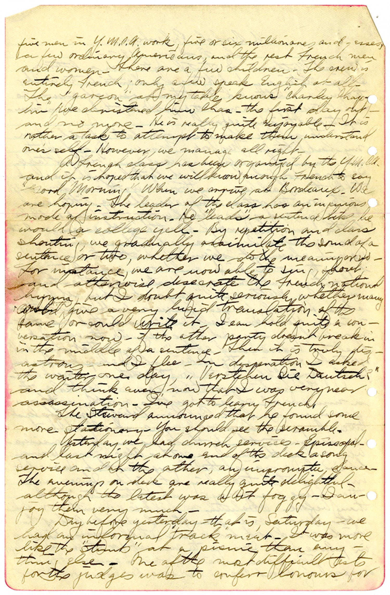 five men in Y.M.C.A. work, five or six millionares and - esses, a few ordinary Americans, and the rest French men and women. There are a few children. The crew is entirely French; only a few speak English at all. The "gareon" at my table knows "Charley Chaplin"I’ve christened him Chas. the first day out - and no more. He is really quite enjoyable. It is rather a task to attempt to make them understand one's self. However, we manage all right. A French class has been organized by the Y.M.C.A. and it is hoped that we will know enough French to say "Good Morning" When we arrive at Bordeaux. We are hoping. The leader of the class has an injurious mode of instruction. He "leads" a sentence like he would a college yell. By repetition and class shouting, we gradually assimilate the sounds of sentence or two, whether we do the meaning or no. For instance, we are now able to sing, shout and otherwise desecrate the French National hymns, but I doubt quite seriously whether many could give a very lucid translation of the same or could write it. I can hold quite a conversation now - if the other party doesn't break in in the middle of a sentence. Then it is truly disastrous and I flee. In desperation I asked the waiter one day, "Verstehen Sie Deutsch?" and think even now that I was very near assassination. I've got to learn French. The Steward announced that he found some more stationary. You should see the scramble. Yesterday we had church services - Episcopal - and last night at one end of the deck a song service and at the other, an impromptu dance. The evenings on deck are really quite delightful- although the latest was a bit foggy. I enjoy them very much. Day before yesterday-that is, Saturday- we had an informal "track" meet. It was more like the "stunts" at the picnic than anything else. One of the most difficult tests for the judges was to conferr honours for
