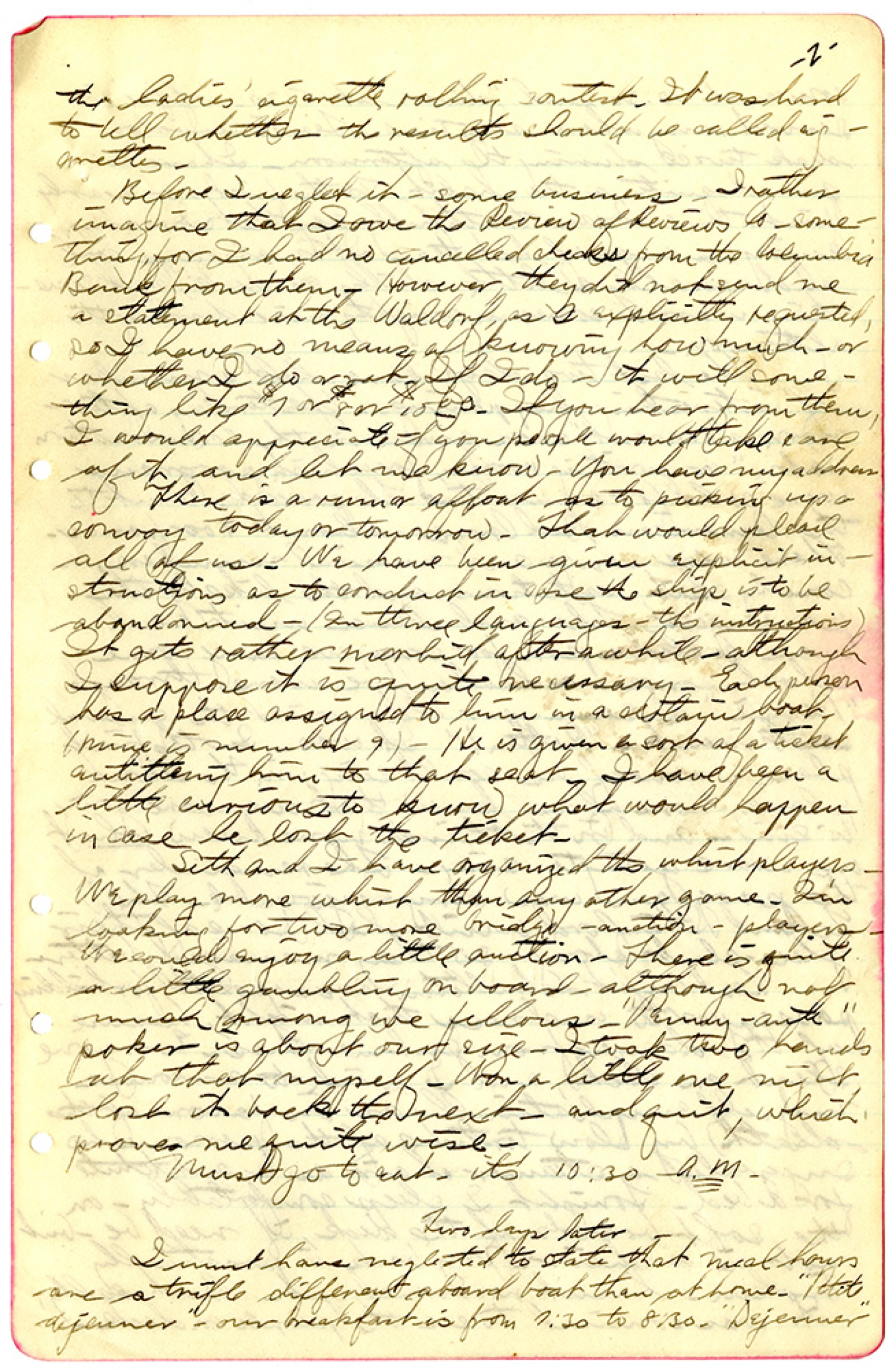 [page 2] the ladies' cigarette rolling contest. It was hard to tell whether the results should be called cigarettes. Before I neglect it - some business - I rather imagine that I owe the Review of Reviews Co. something, for I had no cancelled checks from the Columbia Bank from them. However, they did not send me a statement at the Waldorf, as I explicitly requested, so I have no means of knowing how much - or whether I do or not. If I do - it will something like $7 or $8 or $10.00. If you hear from them, I would appreciate if you people would take care of it and let me know. You have my address. There is a runner afloat as to picking up a convoy today or tomorrow. That would please all of us. We have been given explicit instructions as to conduct in case the ship is to be abandonned - (In three languages - the instructions) It gets rather morbid after a while - although I suppose it is quite necessary. Each person has a place assigned to him in a certain boat. (mine is number 9). He is given a sort of a ticket embittering him to that seat. I have been a little curious to know what would happen in case he lost the ticket. Seth and I have organized the whirl players. We play more whirl than any other game. I'm looking for two more bridge - auction - players. We could enjoy a little auction. There is quite a little gambling on board - although not much among we fellows "Penny-ante" poker is about our size. I took two hands at that myself. Won a little one night lost it back the next - and quit, which proves me quite wise. Must go to eat. it's 10:30 A.M. Two days later I must have neglected to state that meal hours are trifle different aboard boat than at home. "Petite dejeuner" - our breakfast is from 7:30 to 8:30. "Dejeuner"