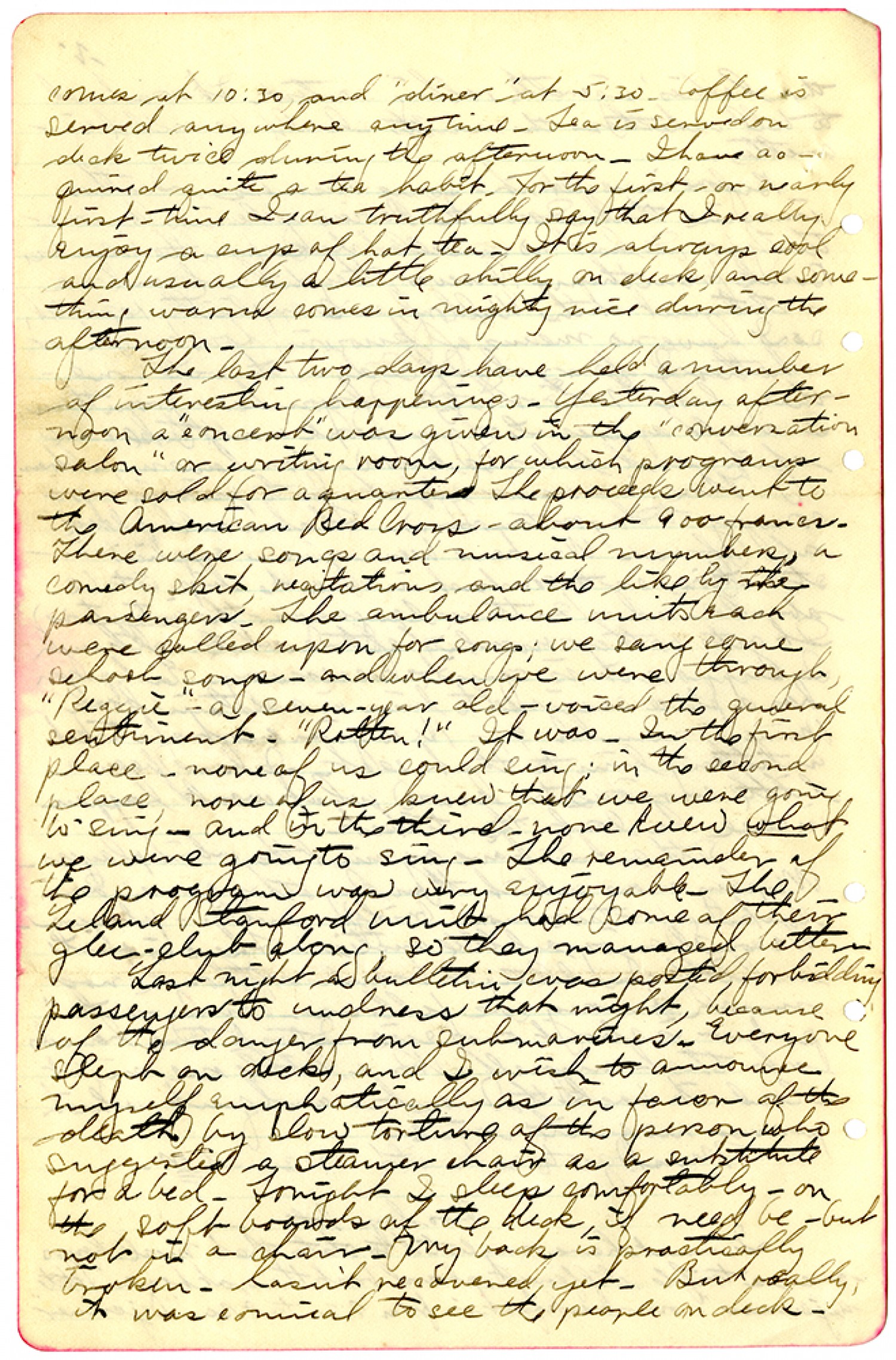comes at 10:30 and "dinner" at 5:30. Coffee is served anywhere anytime. Tea is served on deck twice during the afternoon. I have acquired quite a tea habit. For the first, or nearly first-time I can truthfully say that I really enjoy a cup of hot tea. It is always cool and usually a little chilly on deck, and something warm comes in mighty nice during the afternoon. The last two days have held a number of interesting happenings. Yesterday afternoon a "concert" was given in the "conversation salon" or writing room, for which programs were sold for a quarter. The proceeds went to the American Red Cross - about 900 francs. There were songs and musical numbers, a comedy skit, recitations and the like by the passengers. The ambulance units each were called upon for songs; we sang some school songs - and when we were through "Reggie" - a seven-year old - voiced the general sentiment. "Rotten!" It was. In the first place, none of us could sing; in the second place, none of us knew that we were going to sing, and in the third, none knew what we were going to sing. The remainder of the program was very enjoyable. The Leland Stanford unit had some of their glee-club along, so they managed better. Last night a bulletin was posted, forbidding passengers to undress that night, because of the danger from submarines. Everyone slept on deck, and I wish to announce myself emphatically as in faron of the death by slow torture of this person who suggested a steamer chair as a substitute for a bed. Tonight I sleep comfortably - on the soft boards of the deck. If need be - but not in a chair. My back is practically broken - hasn't recovered yet. But really, it was comical to see the people on deck.