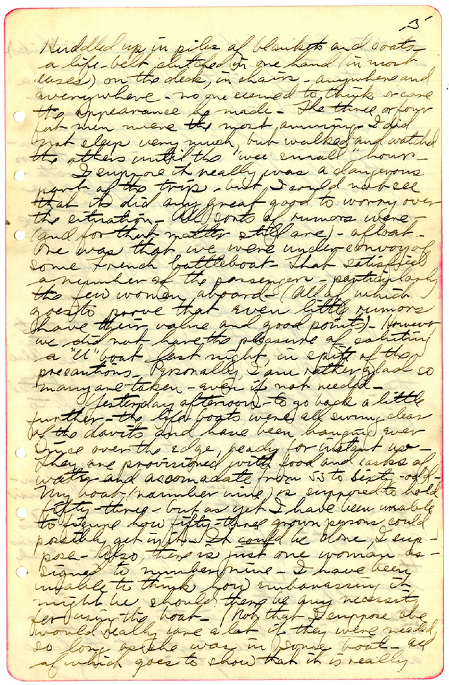 [page 3] Huddled up in piles of blankets and coats, a life-belt clutched in one hand (in most cases) on the deck, in chairs, anywhere and everywhere. No one seemed to think or care the appearance he made. The three of four fat men were the most amusing. I did not sleep very much, but walked and watched the others until the "wee small" hour. I suppose it really was a dangerous part of the trip, but I could not see that it did any great good to worry over the situation. All sorts of rumors were - (and for that matter still are) - afloat. One was that we were under convoy of some French battleboat. That satisfied a number of the passengers - particularly the few women aboard. (All of which goes to prove that even little rumors have their value and good points). However, we did not have the pleasure of saluting a "U" boat last night, in spite of the precautions. Personally, I am rather glad so many are taken - even if not needed. Yesterday afternoon - to go back a little further - the life-boats were all swung clear of the davits and have been hanging ever since over the edge, ready for instant use. They are provisioned with good and casks of water and accomodate from 53 to Sixty-odd. My boat (number nine) is supposed to hold fifty-three, but as yet I have been unable to figure how fifty-three frown persons could possibly get in. It could be done, I suppose. Also, there is just one woman assigned to number nine. I have been unable to think how embarassing it might be should there be any necessity for using the boat. (Not that I suppose she would really care a lot if they were needed, so long as she was in some boat. All of which goes to show that it is really