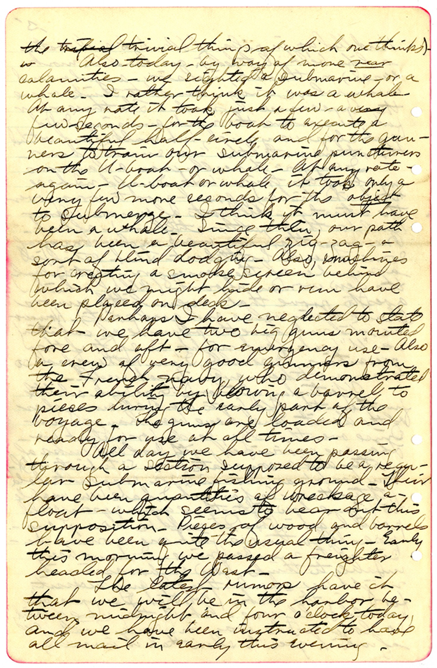 the trivial things of which one thinks). Also today - by way of more near calamities - we sighted a submarine - or a whale. I rather think it was a whale. At any rate it took just a few - a very few - seconds for the boat to execute a beautiful half circle and for the gunners to train our submarine pucturers on the U-boat - or whale. At any rate - again - U-boat or whale, it took only a very few more seconds for the object to submerged. I think it must have been a whale. Since then, our path has been a beautiful zig-zag - a sort of blind dodging. Also, machines for creating a smoke screen behind which we might hide or run have been placed on deck. Perhaps I have neglected to state that we have two big guns mounted for and aft - for emergency use. Also a crew of very good gunners from the French navy, who demonstrated their ability by blowing a barrel to pieces during the early part of the voyage. The guns are loaded and ready for use at all times. All day we have been passing through a section supposed to be regular submarine fishing ground. Their have been quantities of wreckage afloat - which seems to bear out this supposition. Pieces of wood and barrels have been quite the usual thing. Early this morning we passed a freighter headed for the West. The latest rumors have it that we will be in the harbor between midnight and four o'clock today, and we have been instructed to have all mail in early this evening.