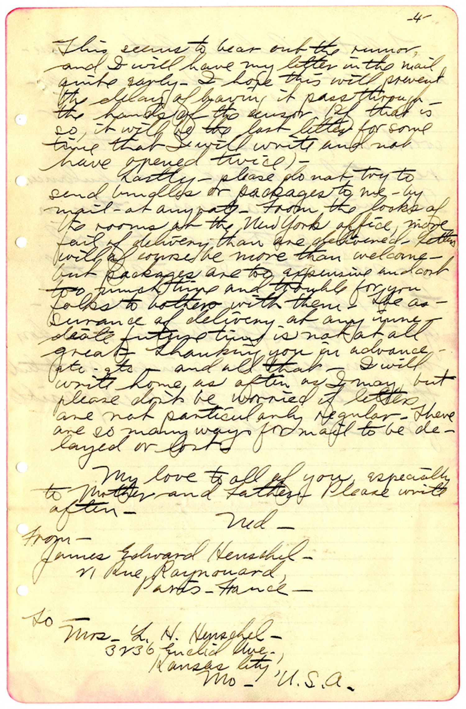 [page 4] This seems to bear out the rumor, and I will have my letter in the mail quite early. I hope this will prevent the delay of having it pass through the hands of the censor. (If that is so, it will be the last letter for some time that I will write and not have opened twice). Lastly - please do not try to send bundles or packages to me - by mail - at any rate. From the looks of the rooms at the New York office, more fail of delivery than are delivered. Letters will of course be more than welcome - but packages are too expensive and cost too much time and trouble for you folks to bother with them. The assurance of delivery at any immediate future time is not all all great. Thanking you in advance - etc. etc - and all that. I will write home as often as I may, but please don't be worried if letters are not particularly regular. There are so many ways for mail to be delayed or lost. My love to all of you, especially to Mother and Father - Please write often. Ned. From - James Edward Henschel. 21 Rue Raynouard, Paris. France - To - Mrs. L.H. Henschel - 3236 Euclid Ave., Kansas City, [Missouri] U.S.A.