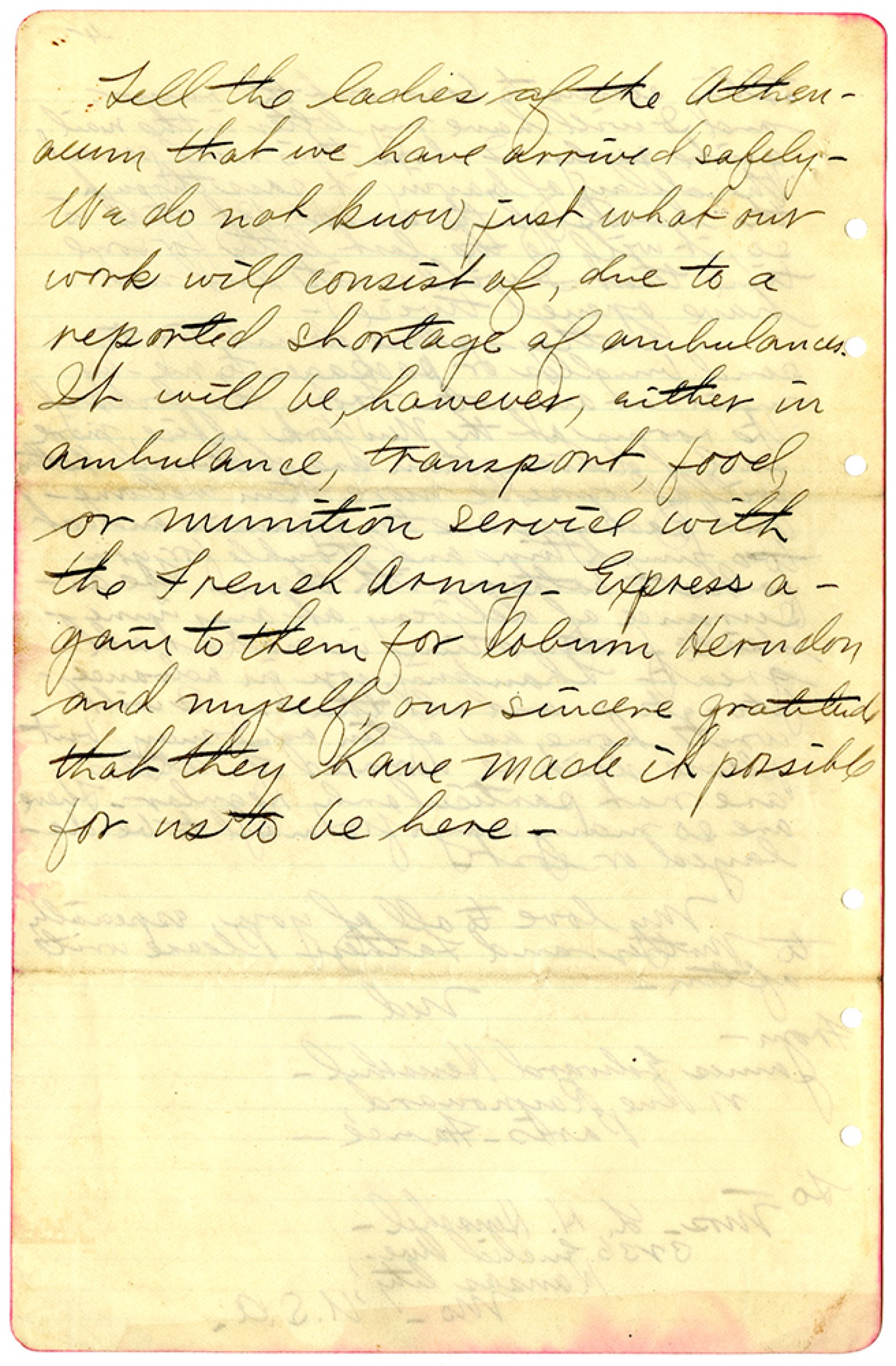 Tell the ladies of the Athenaeum that we have arrived safely. We do not know just what our work will consists of, due to a reported shortage of ambulances. It will be, however, either in ambulance, transport, food, or munition service with the French Army. Express again to them for Coburn Herndon and myself, our sincere gratitude that they have made it possible for us to be here.