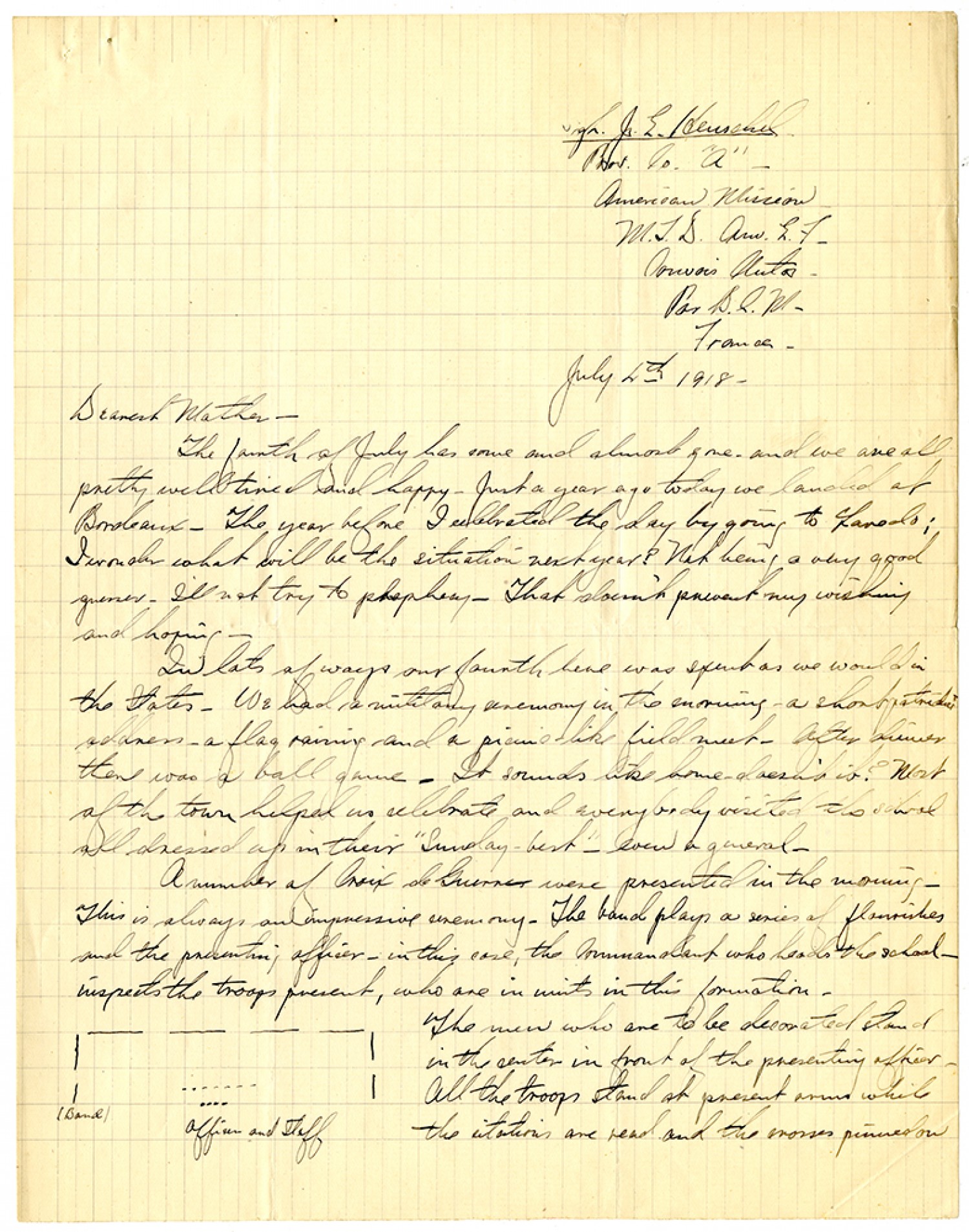 Private J.E. Henschel Prov. Co. "A" - American Mission - M.T.D. Am.E.F. Convois Autos Par. B.C.M.- France - July 4th 1918 - Dearest Mother - The fourth of July has come and almost gone and we are all pretty well tired and happy. Just a year ago today we landed at Bordeaux. The year before I celebrated the day by going to Laredo; I wonder what will be the situation next year? Not being a very good guess - I'll not try to prophecy. That doesn't prevent my wishing and hoping. In lots of ways our fourth here was spent as we would in the States. We had a military ceremony in the morning - a short patriotic address - a flag raising and a picnic-like field meet. After dinner there was a ball game. It sounds like home - doesn't it? Most of the town helped us celebrate and everybody visited the school all dressed up in their "Sunday-best" - even a general. A number of Croix de Guerres were presented in the morning. This is always an impressive ceremony. The band plays a series of flourishes and the presenting officer - in this case, the Commandant who heads the school - inspects the troops present, who are in units in this formation [diagram of troops] (Band) Officers and Staff The men who are to be decorated stand in the center in front of the presenting officer. All the troops stand at present arms while the citations are read and the crosses pinned on
