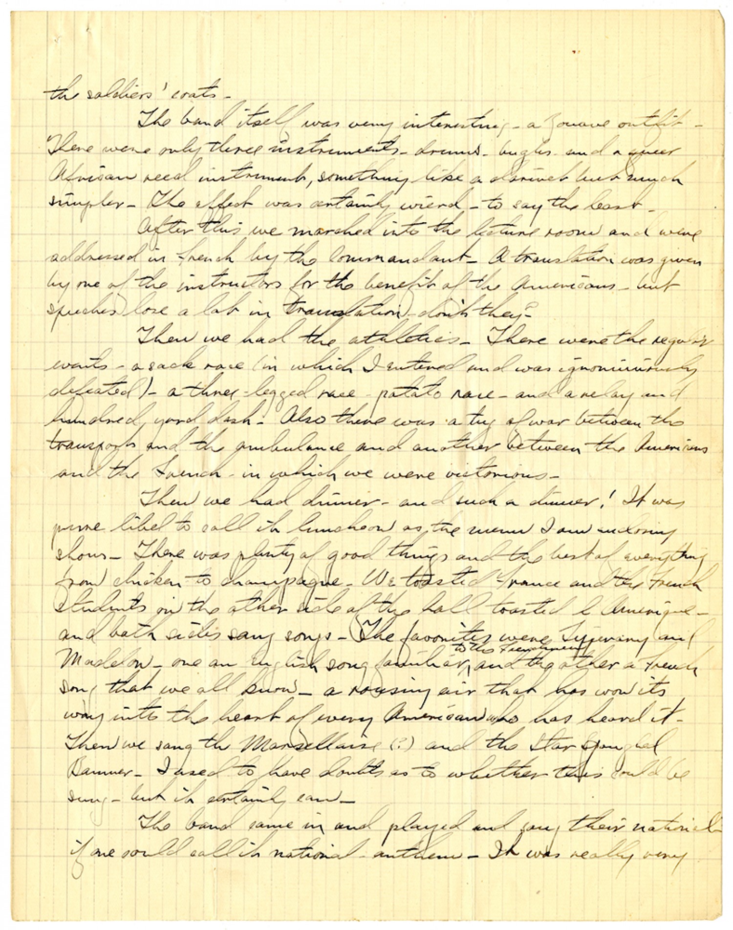 the soldiers' coats. The band itself was very interesting - a Zouve outfit. There were only three instruments - drums - bugles - and a queer African reed instrument, something like a clarinet but much simpler. The effect was certainly wierd - to say the least. After this we marched into the lecture room and were addressed in French by the Commandant. A translation was given by one of the instructors for the benefit of the Americans - but speeches hose a lot in translation - don't they? Then we had the athletics. There were the regular events - a sack race (in which I entered and was ignominiously defeated) - a three-legged race - potato race - and a relay and hundred yard dash. Also there was a tug of war between the transport and the ambulance and another between the Americans and the French in which we were victorious. Then we had dinner - and such a dinner! It was pure libel to call it luncheon as the menu I am enclosing shows. There was plenty of good things and the best of everything from chicken to champagne. We toasted France and the French students on the other side of the hall toasted l'Amerique - and both sides sang songs. The favorites were Tipperary and Madelon - one an English song familiar to the Frenchmen and the other a French son that we all know - a rousing air that has wont its way into the heart of every American who has heard it. Then we sang the Marsellaise (?) and the Star Spangled Banner. I used to have doubts as to whether this could be sung - but it certainly can. The band came in and played and sang their national - if one could call it national - anthem. It was really very