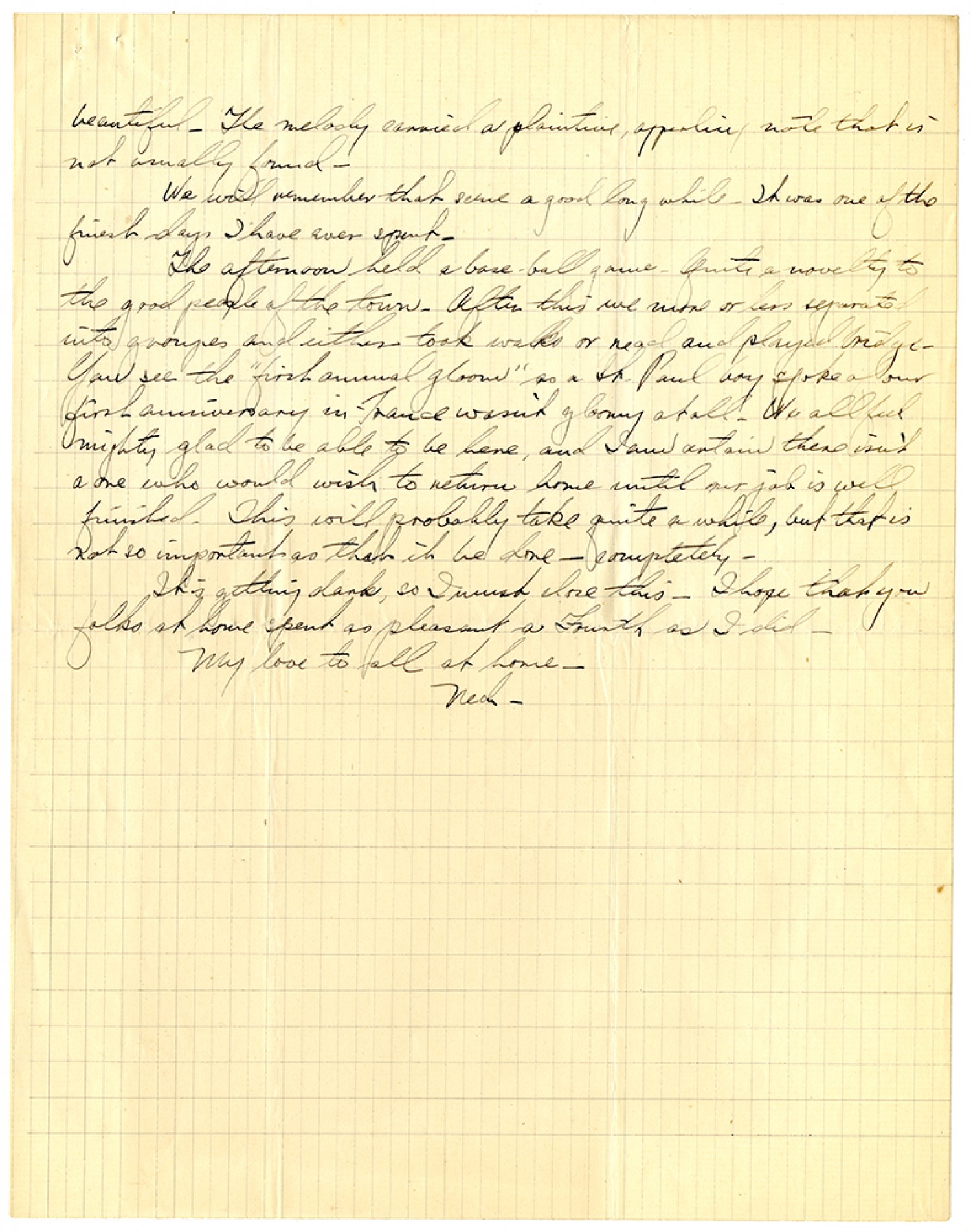 beautiful. The melody carried a plaintive, appealing note that is not usually found. We will remember that scene a good long while. It was one of the finest days I have ever spent. The afternoon held a base-ball game. Quite a novelty to the good people of the town. After this we more or less separated into groupes and either took walks or read and played bridge. You see the "first annual gloom" as a St. Paul boy spoke of our first anniversary in France wasn't gloomy at all. We all feel mighty glad to be able to be here, and I am certain there isn't a one who would wish to return home until our job is well finished. This will probably take quite a while, but that is not so important as that it be done - completely. It is getting dark, so I must close this. I hope that you folks at home spent as pleasant a Fourth as I did. My love to all at home. Ned.