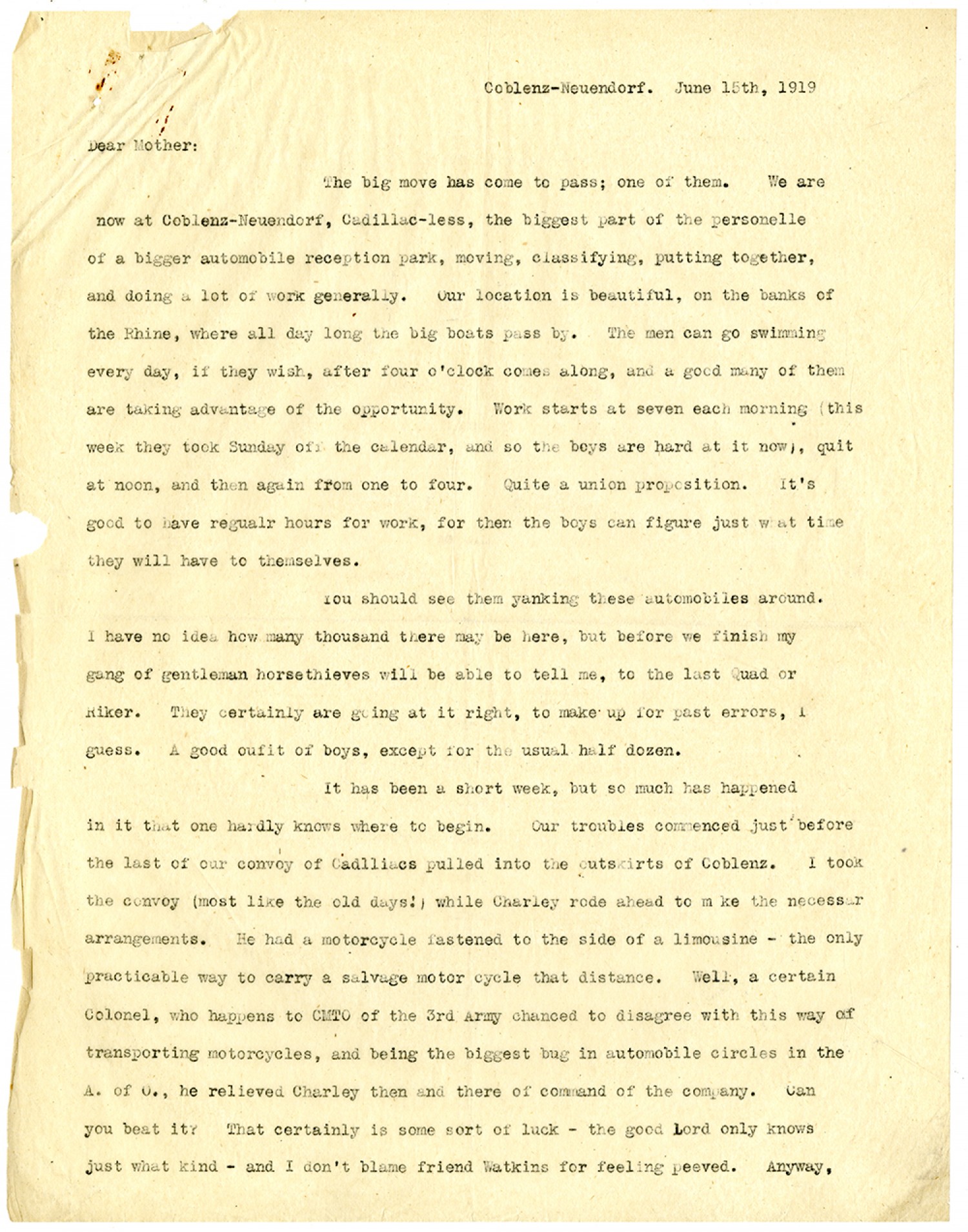 Coblenz-Neuendorf. June 15th, 1919 Dear Mother: The big move has come to pass; one of them. We are now at Coblenz-Neuendorf, Cadillac-less, the biggest part of the personelle of a bigger automobile reception park, moving, classifying, putting together, and doing a lot of work generally. Our location is beautiful, on the banks of the Rhine, where all day long the big boats pass by. The men can go swimming every day, if they wish, after four o'clock comes along, and a good many of them are taking advantage of the opportunity. Work starts at seven each morning (this week they took Sunday off the calendar, and so the boys are hard at it now, quit at noon, and then again from one to four. Quite a union proposition. It's good to have regular hours for work, for then the boys can figure just what time they will have to themselves. You should see them yanking these automobiles around. I have no idea how many thousand there may be here, but before we finish my gang of gentleman horsethieves will be able to tell me, to the last Quad or Riker. They certainly are going at it right, to make up for past errors, I guess. A good outfit of boys, except for the usual half dozen. It has been a short week, but so much has happened in it that one hardly knows where to begin. Our troubles commenced just before the last of our convoy of Cadlliacs pulled into the outskirts of Coblenz. I took the convoy (most like the old days!) while Charley rode ahead to make the necessary arrangements. He had a motorcycle fastened to the side of a limousine - the only practicable way to carry a salvage motor cycle that distance. Well, a certain Colonel, who happens to CMTO of the 3rd Army chanced to disagreed with this way of transporting motorcycles, and being the biggest bug in automobile circles in the A. of O., he relieved Charley then and there of command of the company. Can you beat it? That certainly is some sort of luck - the good Lord only knows just what kind - and I don't blame friend Watkins for feeling peeved. Anyway,