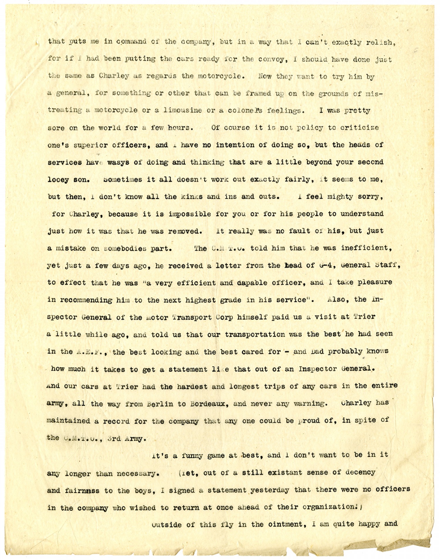 that puts me in command of the company, but in a way that I can't exactly relish, for if I had been putting the cars ready for the convoy, I should have done just the same as Charley as regards the motorcycle. Now they want to try him by a general, for something or other that can be framed up on the grounds of mistreating a motorcycle or a limousine or a colonel's feelings. I was pretty sore on the world for a few hours. Of course it is not policy to criticize one's superior officers, and I have no intention of doing so, but the heads of services have ways of doing and thinking that are a little beyond your second looey son. Sometimes it all doesn’t work out exactly fairly, it seems to me, but then, I don't know all the kinks and ins and outs. I feel might sorry, for Charley, because it is impossible for you or for his people to understand just how it was that he was removed. It really was no fault of his, but just a mistake on somebodies part. The C.M.T.O. told him that he was inefficient, yet just a few days ago, he received a letter from the head of G-4, General Staff, to effect that he was "a very efficient and capable officer, and I take pleasure in recommending him to the next highest grade in his service". Also, the inspector General of the Motor Transport Corp himself paid us a visit at Trier a little while ago, and told us that our transportation was the best he had seen in the A.E.F., the best looking and the best cared for - and Dad probably knows how much it takes to get a statement like that out of an Inspector General. And our cars at Trier had the hardest and longest trips of any cars in the entire army, all the way from Berlin to Bordeaux, and never any warning. Charley has maintained a record for the company that any one could be proud of, in spite of the C.M.T.O., 3rd Army. It's a funny game at best, and I don't want to be in it any longer than necessary. (Yet, out of a still existant sense of decency and fairness to the boys, I signed a statement yesterday that there were no officers in the company who wished to return at once ahead of their organization!) Outside of this fly in the ointment, I am quite happy and