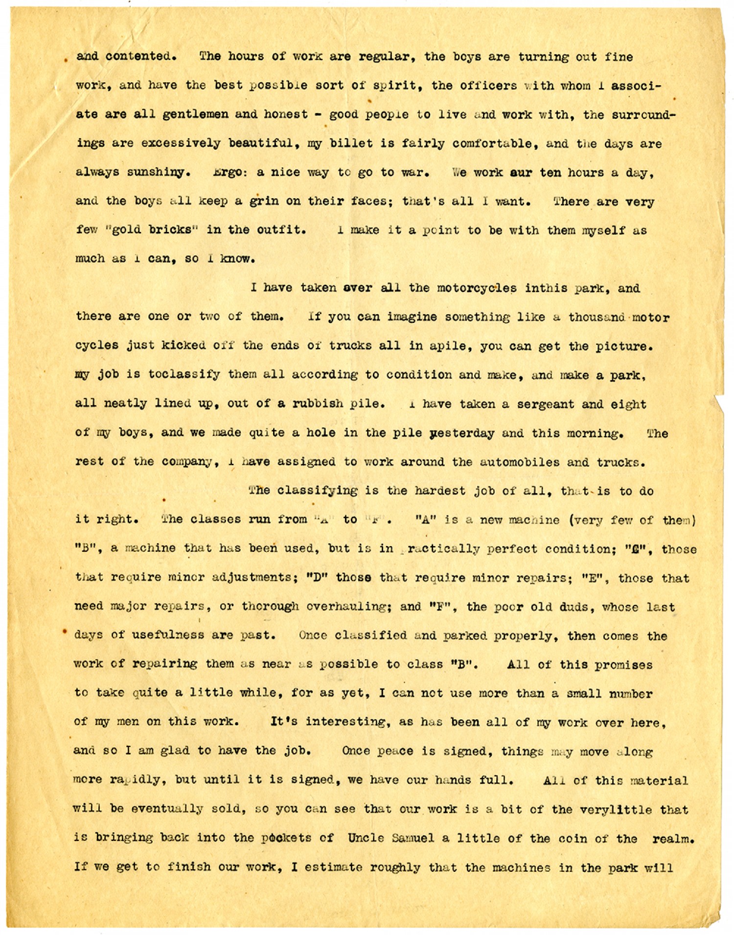 and contented. The hours of work are regular, the boys are turning out fine work, and have the best possible sort of spirit, the officers with whom I associate are all gentlemen and honest - good people to live and work with, the surroundings are excessively beautiful, my billet is fairly comfortable, and the days are always sunshiny. Ergo: a nice way to go to war. We work our ten hours a day, and the boys all keep a grin on their faces; that's all I want. There are very few "gold bricks" in the outfit. I make it a point to be with them myself as much as I can, so I know. I have taken over all the motorcycles in this park, and there are one or two of them. If you can imagine something like a thousand motor cycles just kicked off the ends of trucks all in a pile, you can get the picture. my job is to classify them all according to condition and make, and make a park, all neatly lined up, out of a rubbish pile. I have taken a sergeant and eight of my boys, and we made quite a hole in the pile yesterday and this morning. The rest of the company, I have assigned to work around the automobiles and trucks. The classifying is the hardest job of all, that is to do it right. The classes run from "A" to "F". "A" is a new machine (very few of them) "B", a machine that has been used, but is in practically perfect condition; "C", those that require minor adjustments; "D" those that require minor repairs; "E" those that need minor repairs or thorough overhauling; and "F", the poor old duds, whose last days of usefulness are past. Once classified and parked properly, then comes the work of repairing them as near as possible to class "B". All of this promises to take quite a little while, for as yet, I can not use more than a small number of my men on this work. It's interesting, as has been all of my work over here, and so I am glad to have the job. Once peace is signed, things may move along more rapidly, but until it is signed, we have our hands full. All of this material will be eventually sold, so you can see that our work is a bit of the very little that is bringing back into the pockets of Uncle Samuel a little of the coin of the realm. If we get to finish our work, I estimate roughly that the machines in the park will