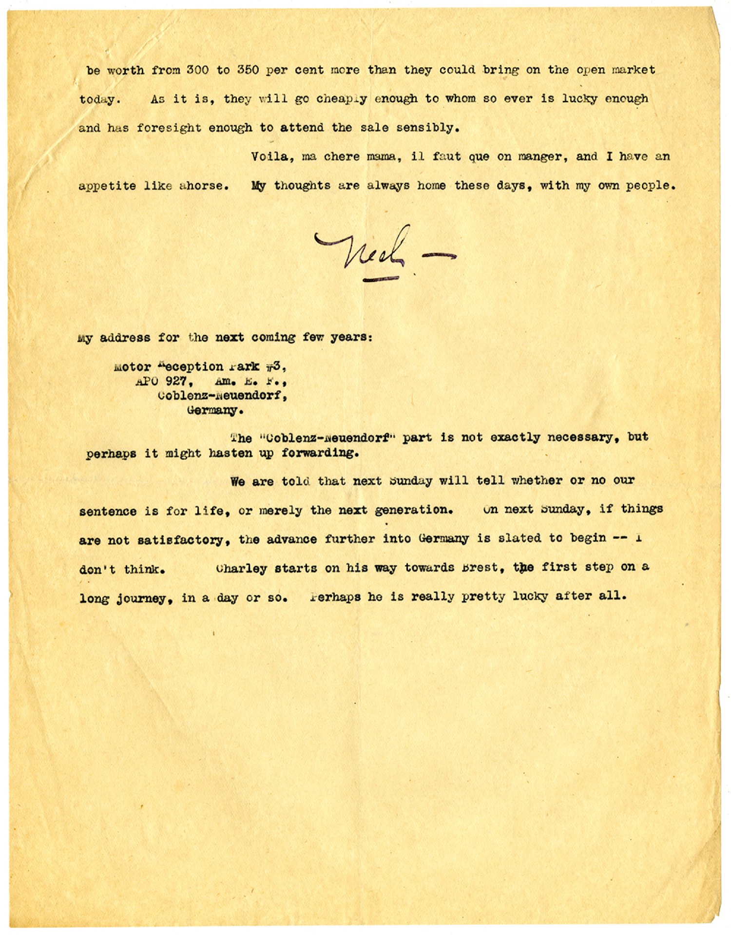 be worth from 300 to 350 per cent more than they could bring on the open market today. As it is, they will go cheaply enough to whom so ever is lucky enough and has foresight enough to attend the sale sensibly. Voila, ma chere mama, il faut que on manger, and I have an appetite like a horse. My thoughts are always home these days, with my own people. Ned - My address for the next coming few years: Motor Reception Park #3, APO 927, Am. E. F., Coblenz-Neuendorf, Germany. The "Coblenz-Neuendorf" part is not exactly necessary, but perhaps it might hasten up forwarding. We are told that next Sunday will tell whether or no our sentence is for life, or merely the next generation. On next Sunday, if things are not satisfactory, the advance further into Germany is slated to begin -- I don't think. Charley starts on his way towards Brest, the first step on a long journey, in a day or so. Perhaps he is really pretty lucky after all.