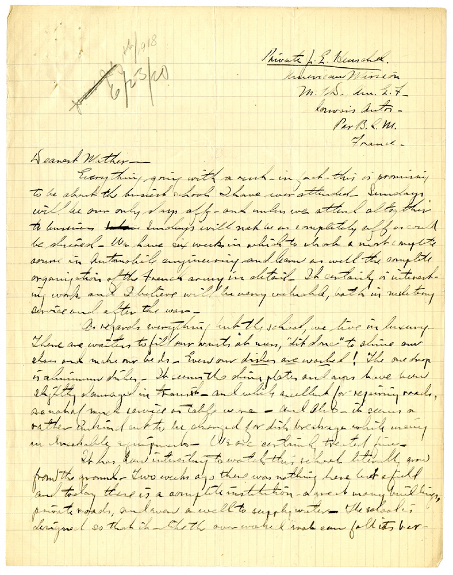 Private J.E. Henschel. American Mission M.T.D. Am.E.F. Convois Autos - Par B.C.M. France - [June 23, 1918] Dearest Mother - Everything going with a rush - in fact this is promising to be about the busiest school I have ever attended. Sundays will be our only days off - and unless we attend altogether to business Sunday will not be as completely off as could be desired. We have six weeks in which to absorb a most complete course in Automobile engineering and learn as well the complete organization of the French army in detail. It certainly is interesting work and I believe will be very valuable, both in military service and after the war. As regards everything but the school, we live in luxury. There are waiters to fill our wants at mess, "dit done" to shine our shoes and make our beds. Even our dishes are washed! The one drop is aluminum dishes. It seems the dinner plates and cups have been slightly damaged in transit - and while excellent for repairing roads, are not of much service as table ware - and also - it seems a rather unkind cut to be charged for dish breakage while using unbreakable equipment. We are certainly treated fine. It has been interesting to watch this school literally grow from the ground. Two weeks ago there was nothing here but a field and today there is a complete institution a great many buildings, private roads, and even a well to supply water. The school is designed so that it - like the overworked [ms illegible: 1 wd] can fold its bar-