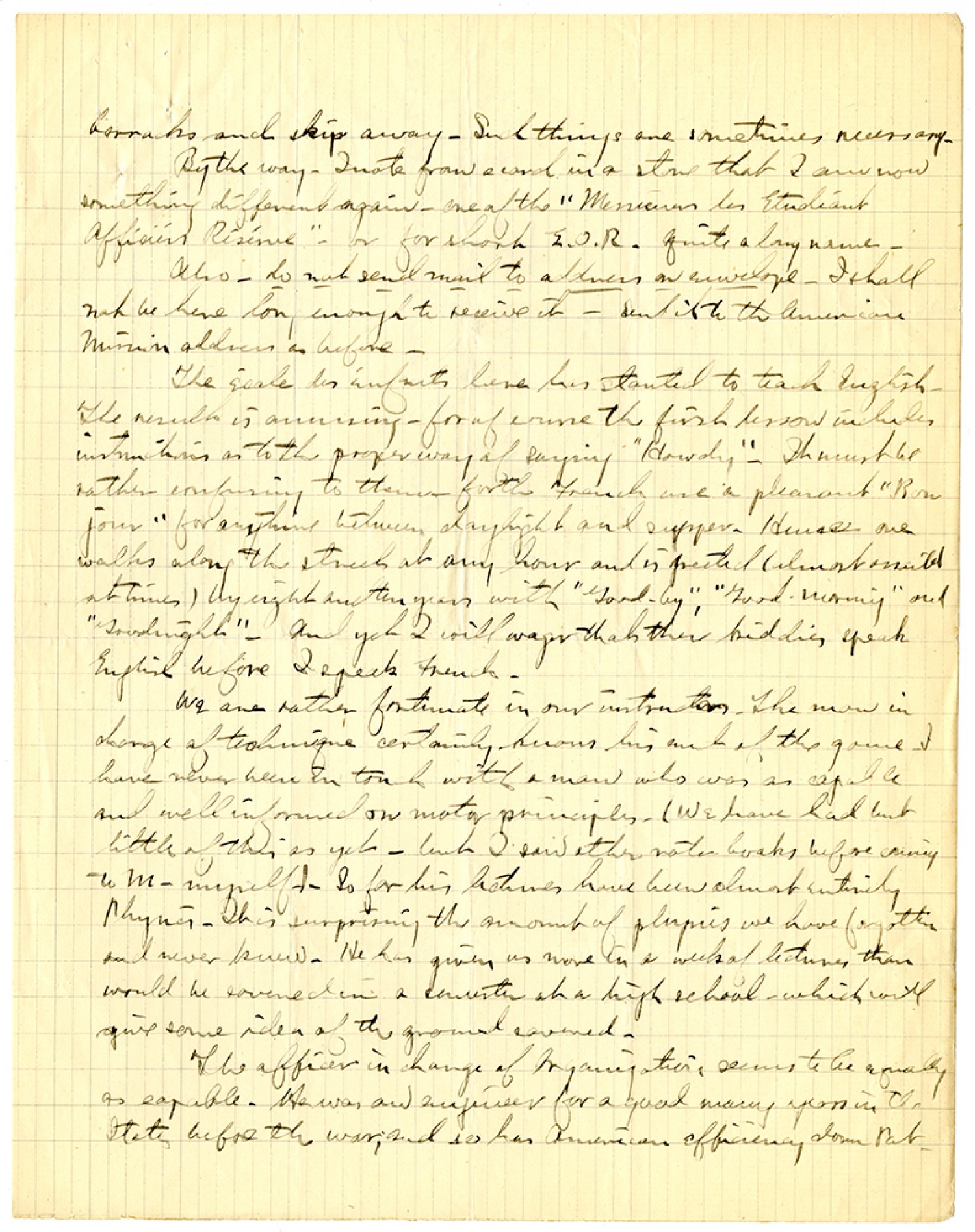 barracks and skip away. Such things are sometimes necessary. By the way - I note from a card in a store that I am now something different again - one of the "Monsieur les Etudiant Officier Reserve" - or for short E.O.R. quite a long name. Also - do not send mail to address an envelope. I shall not be here long enough to receive it. Send it to the American Mission address as before. The ecole des enfants here has started to teach English. The result is amusing - for of course the first lesson includes instructions as to the proper way of saying "Howdy". It must be rather confusing to them - for the French use a pleasant "Bon jour" for anytime between daylight and supper. Hence one walks along the street at any hour and is greeted (almost assulted at times) by eight and ten years with "Good-by", "Good-morning" and "Goodnight". And yet I will wager that there kiddies speak English before I speak French. We are rather fortunate in our instructors. The man in charge of technique certainly knows his end of the game. I have never been in touch with a man who was as capable and well informed on motor principles. (We have had but little of this as yet - but I saw other note-books before coming to M- myself). So far his lectures have been almost entirely physics. This surprising the amount of plupies we have forgotten and never knew. He has given us more in a week of lectures that would be covered in a semester at a high school - which will give some idea of the ground covered. The officer in charge of organization seems to be equally as capable. He was an engineer for a good many years in the States before the war; and so has American efficiency down pat.