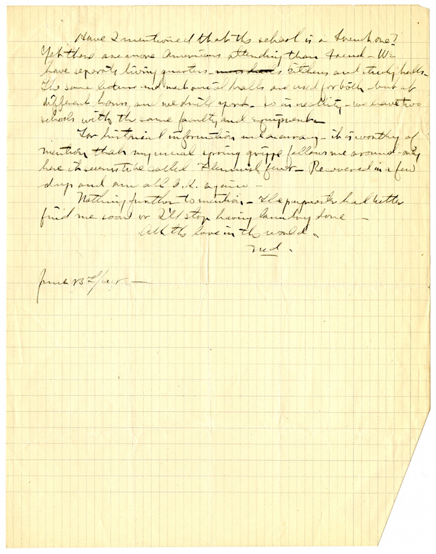 Have I mentioned that the school is a French one? Yet there are more Americans attending than French. We have separate living quarters - kitchens and study halls. The same lecture and mechanical halls are used for both but at different hours, and we drill apart. So in reality - we have two schools with the faculty and equipment. For historical information and accuracy - it is worthy of mention that my usual spring grippe follows me around - only here it seems to be called Flemmish fever. Recovered in a few days and am all O.K. again. Nothing further to mention. The paymaster had better find me soon or I'll stop having laundry done. All the love in the world. Ned. June 23/1918 -