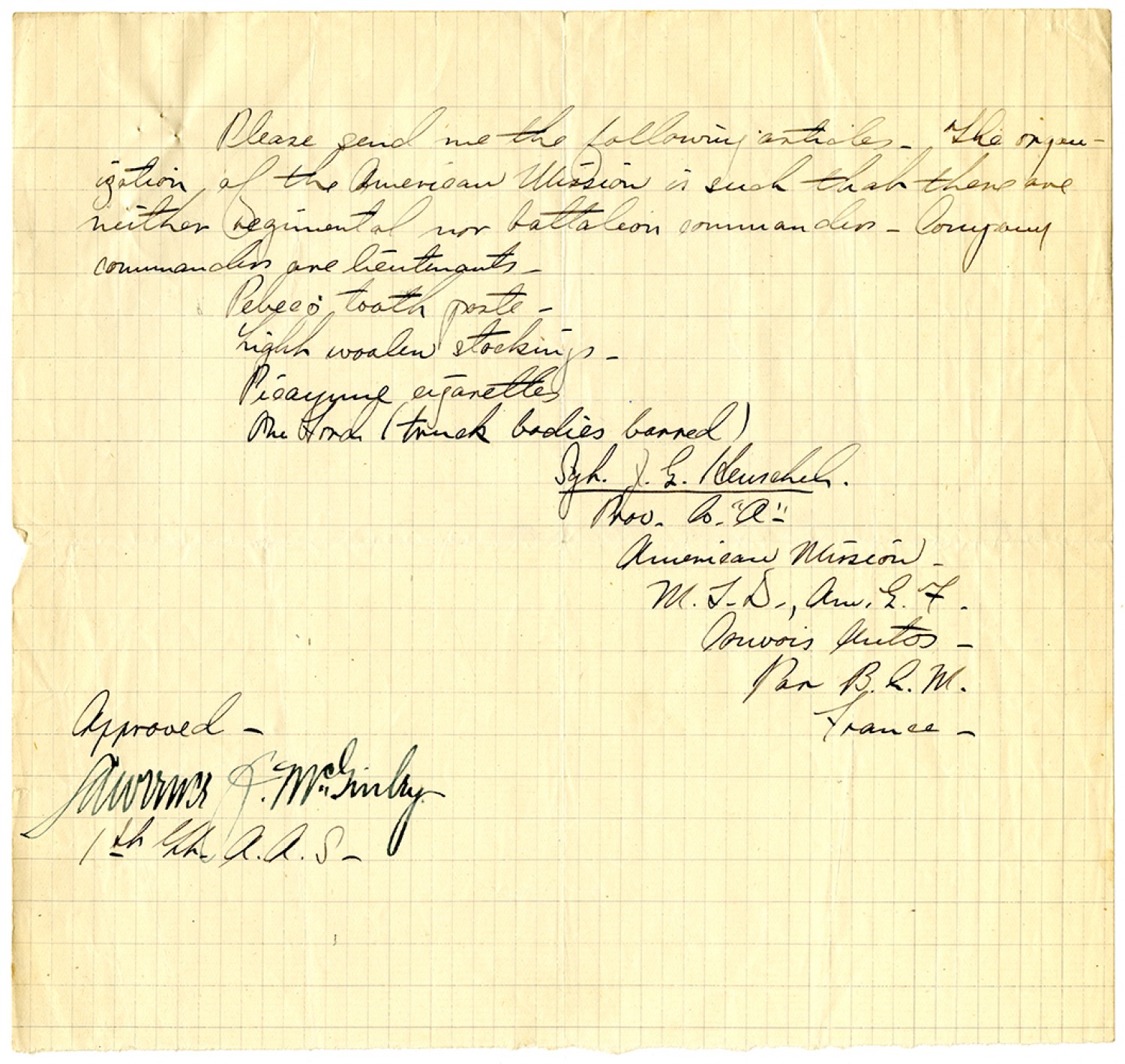 Please send me the following articles. The organization of the American Mission is such that there are neither regiment nor battalion commanders. Company commanders are lieutenants. Pebeeo tooth poste - Light woalen stockings - Picayme cigarettes One Ford (truck bodies barred) Sgt. J.E. Henschel Prov. Co. “A” American Mission. M.T.D. Am. E.F. Ouvois Autos. Par B.L.M. France -