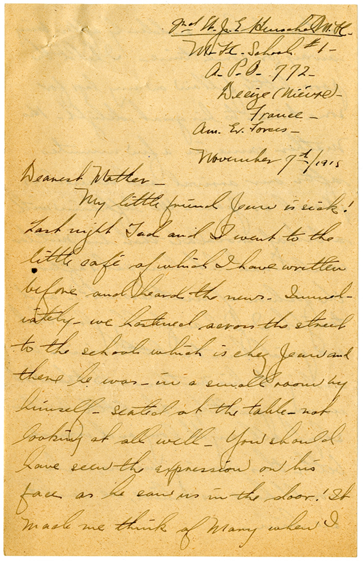 2nd Lt. J.E. Henschel M.T.C. M.T.C. School #1 A.P.O. 772 - Decize (Nievre) - France - Am. Ex. Forces - November 7th/1918 Dearest Mother - My little friend Jean is sick! Last night Tad and I went to the little cafe of which I have written before and heard the news. Immediately - we hastened across the street to the school which is chez Jean and there he was - in a small room by himself - seated at the table - not looking at all well. You should have seen the expression on his face as he saw us in the door! It made me think of Mary when I