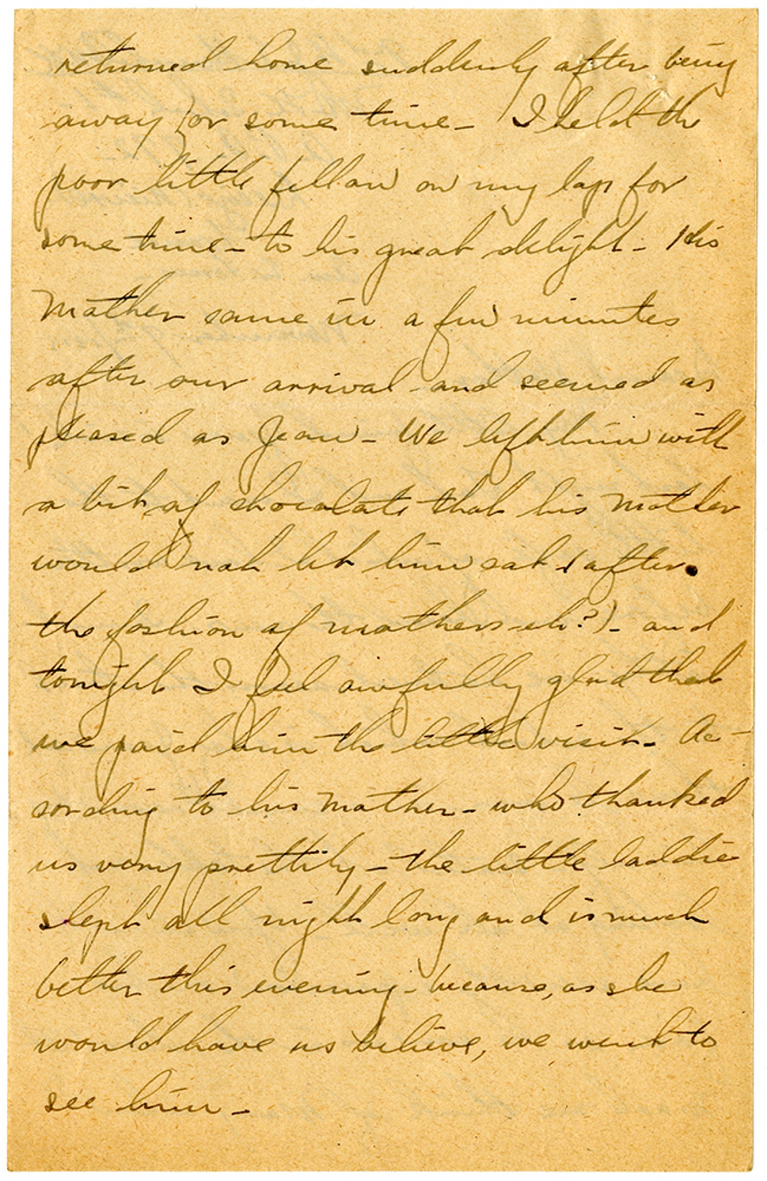 returned home suddenly after being away for some time. I held the poor little fellow on my lap for some time - to his great delight. His Mother came in a few minutes after our arrival - and seemed as pleased as Jean. We left him with a bit of chocolate that his Mother would not let him eat (after the fashion of Mothers - eh?) - and tonight I feel awfully glad that we paid him the little visit. According to his Mother - who thanked us very prettily - the little laddie slept all night long and is much better this evening - because, as she would have us believe, we went to see him.
