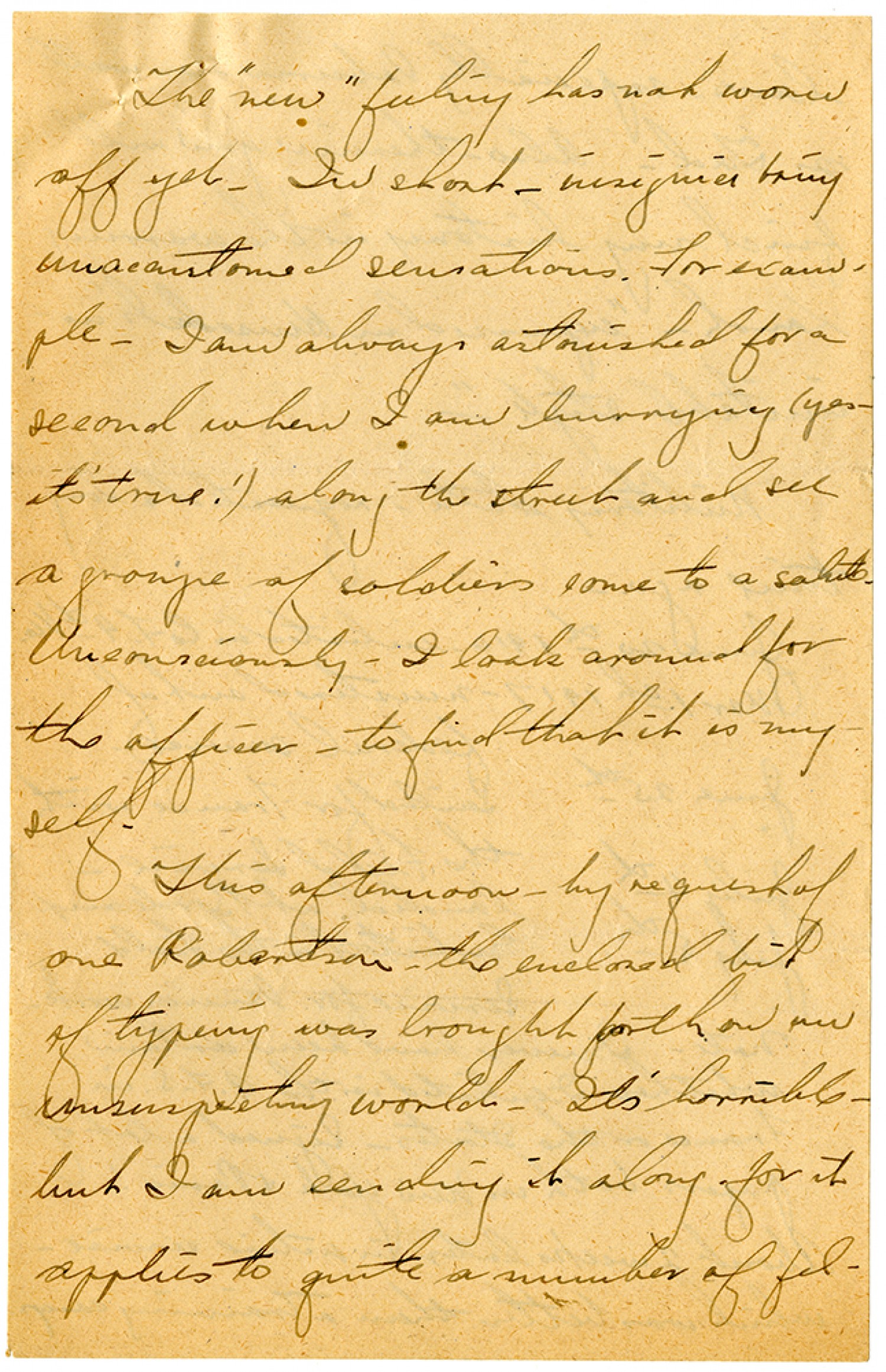 The "new" feeling has not worn off yet. In short - insignia being unaccustomed sensations. For example - I am always astonished for a second when I am hurrying (yes it's true!) along the street and see a groupe of soldiers come to a salute. Unconsciously - I look around for the officer - to find that it is myself. This afternoon - by request of one Robertson - the enclosed bit of typeing was brought forth on an unsuspecting world. It's horrible but I am sending it along for it applies to quite a number of fel-