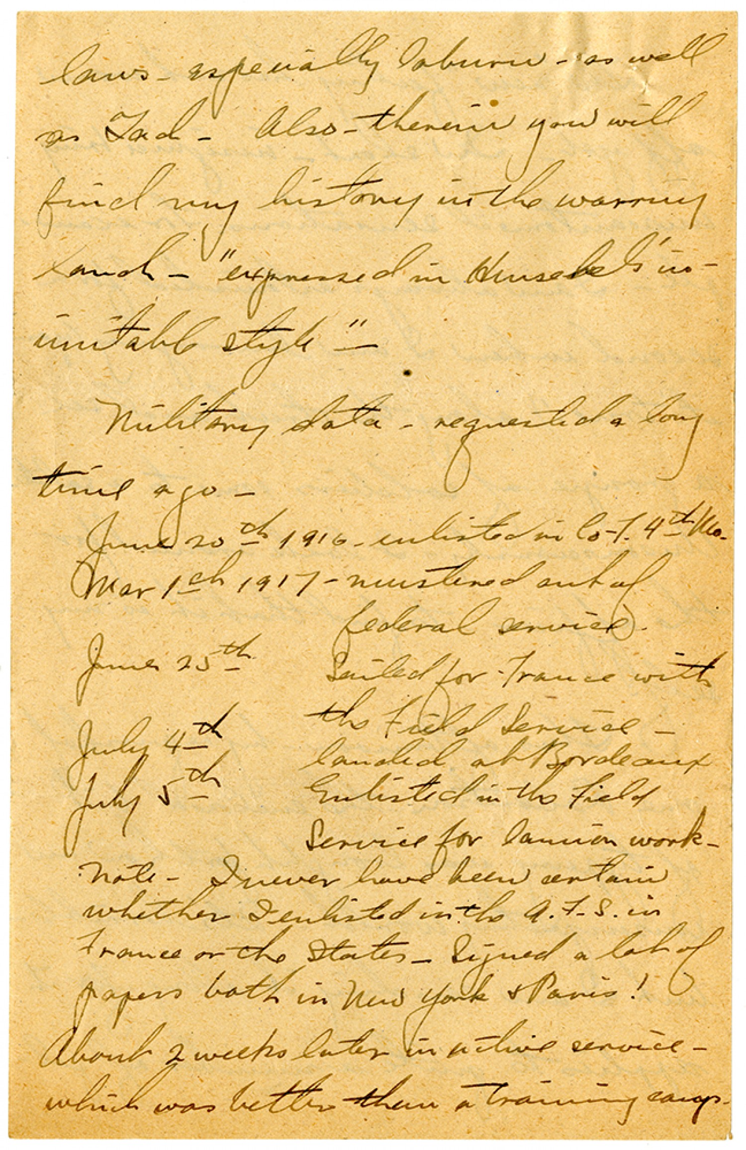 lows - especially Coburn - as well as Tad. Also - therein you will find my history in the warring bunch - "expressed in Henschel's inimitable style". Military data - requested a long time ago - June 20th 1916 - enlisted in Co. F. 4th [Missouri] [March] 1st 1917 - mustered out of federal service. June 25th Sailed for France with the Field Service - July 4th landed at Bordeaux July 5th Enlisted in the Field Service for camion work - Note - I never have been certain whether I enlisted in the A.F.S. in France or the States. Signed a lot of papers both in New York & Paris! About 2 weeks later in active service - which was better than a training camp.