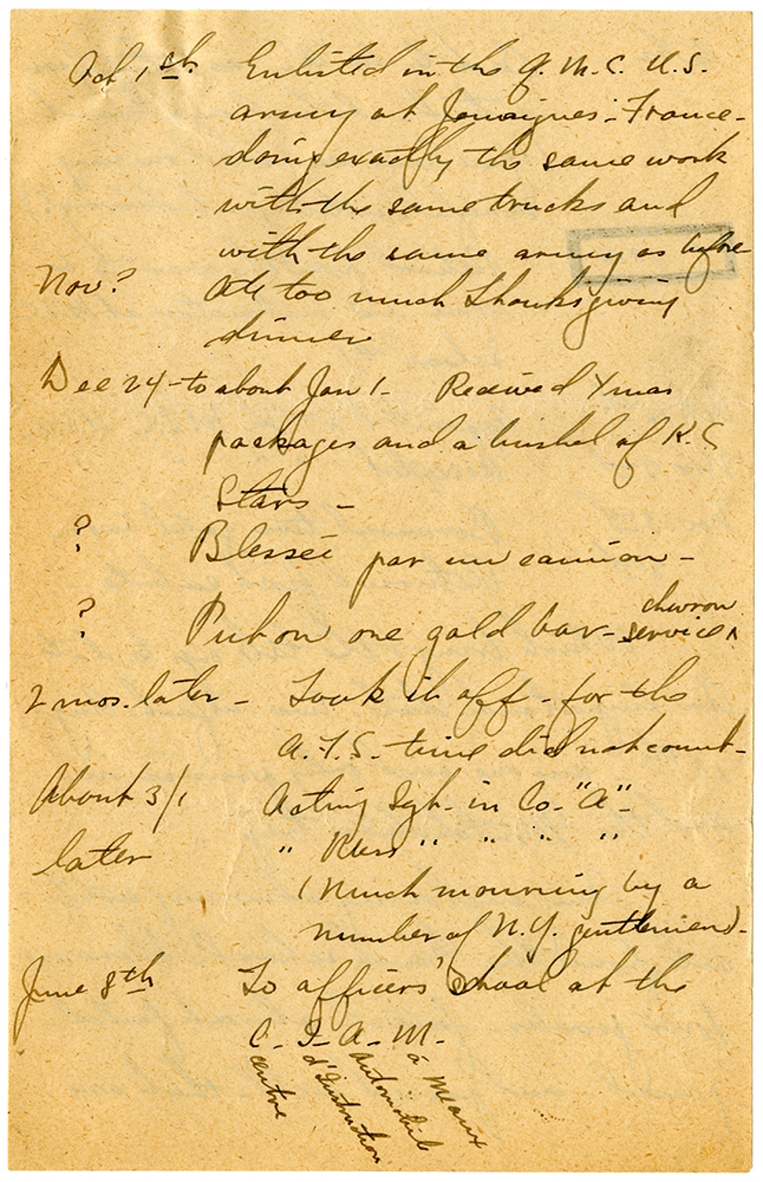 [October] 1st Enlisted in the Q.M.C. U.S. army at Jouaignes-France - doing exactly the same work with the same trucks and with the same army as before [November]? Ate too much Thanksgiving dinner [December] 24 to about [January] 1. Received Xmas packages and a bushel of [Kansas City] Stars - ? Blessei par un camion - ? Put on one gold bar - service chevron 2 mos. later - Took it off - for the A.F.S. time did not county. About 3/1 Acting Sgt. in Co. "A". later [Acting ]Mess [Sergeant in Company A] (Much mourning by a number of [New York] gentleman. June 8th To officers' school at the Centre d'Instruction Automobile a Meaux