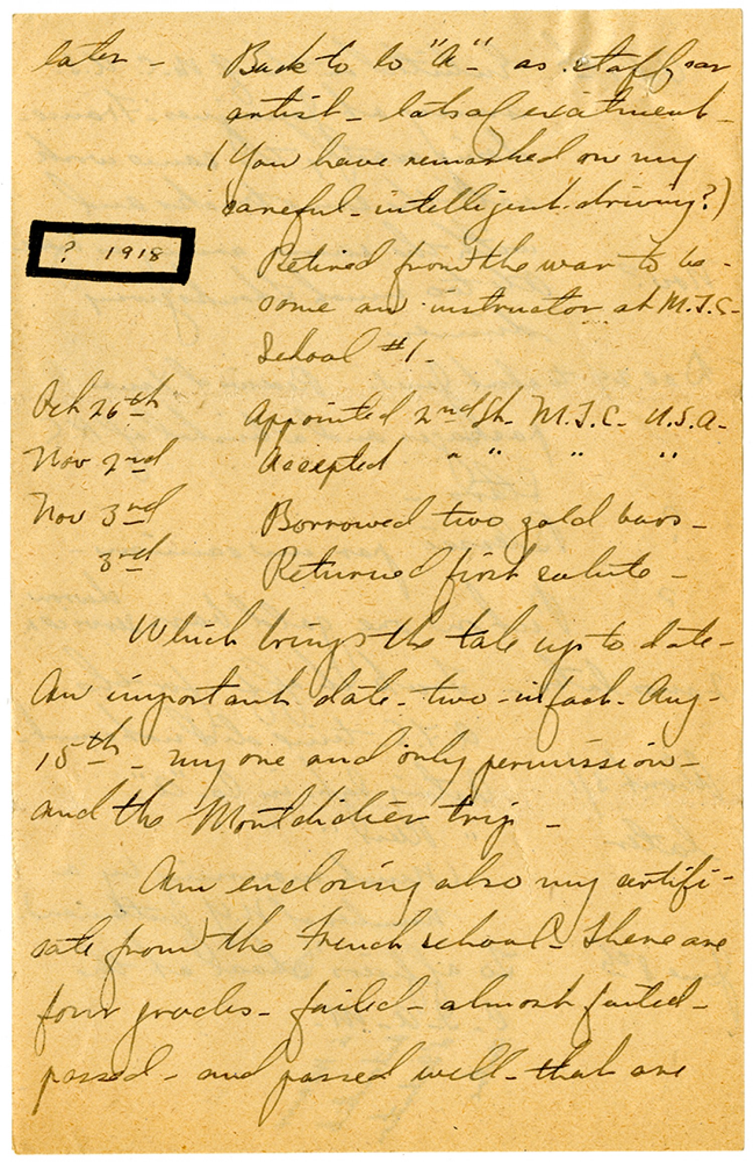 later - Back to Co "A" - as staff car artist - lots of excitement - (You have remarked on my careful - intelligent driving?) ? 1918 Retired from the war to become an instructor at M.T.C. School #1. [October] 26th Appointed 2nd Lt. M.T.C. U.S.A. [November] 2nd Accepted [2nd Lieutenant M.T.C. U.S.A.] [November] 3rd Borrowed two gold bars - 3rd Returned first salute. Which brings the tale up to date. An important date - two - in fact. [August] 15th - my one and only permission and the Montdidier trip. Am enclosing also my certificate from the French school. There are four grades - failed - almost failed - passed - and passed well - that are