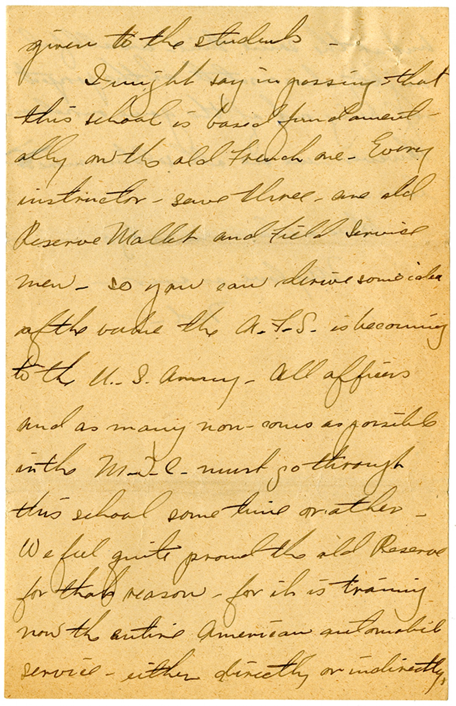 given to the students. I might say in passing that this school is based fundamentally on the old French one. Every instructor - save three - are old Reserve Mallet and Field Service men - so you can derive some idea of the value of the A.F.S. is becoming to the U.S. Army. All officers and as many non-coms as possible in the M.T.C. must go through this school some time or other. We feel quite proud of the old Reserve for that reason - for it training now the entire American automobile service - either directly or indirectly,